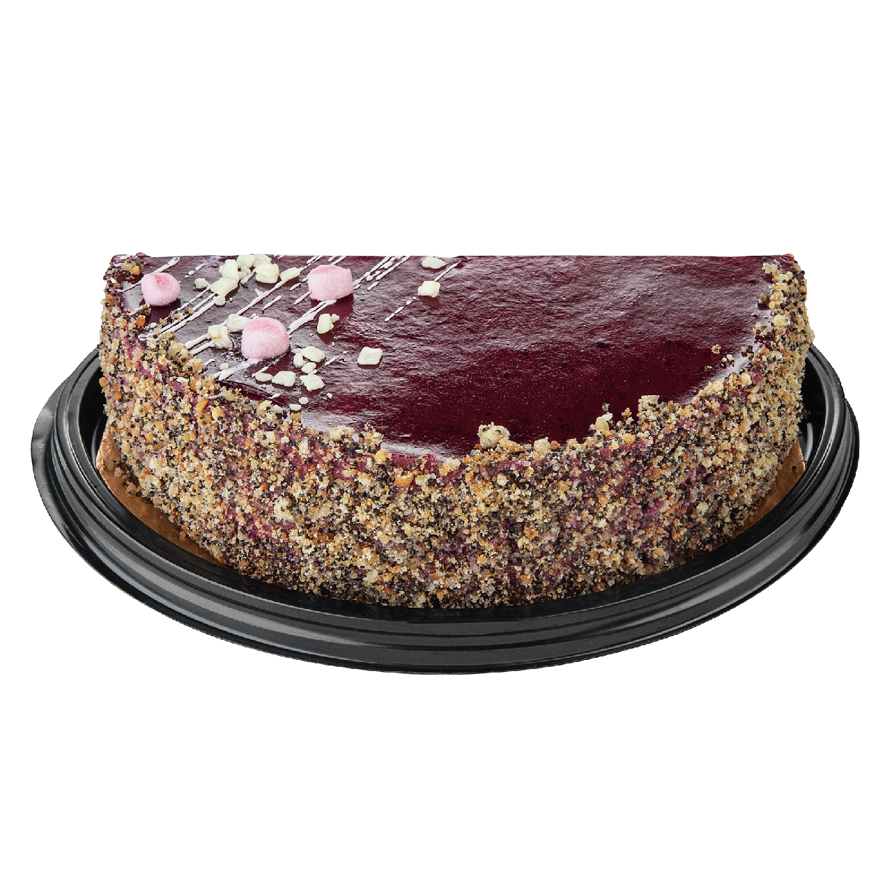 Торт состоит из нежного пропитанного макового бисквита, прослоенного ганашом на основе натуральной черники, черничной начинки. Покрыт торт черничным желе.