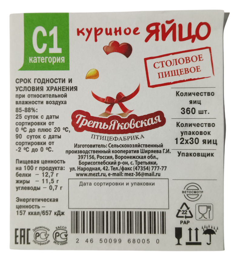 Яйцо куриное Третьяковская ПФ пищевое столовое С1, 360шт