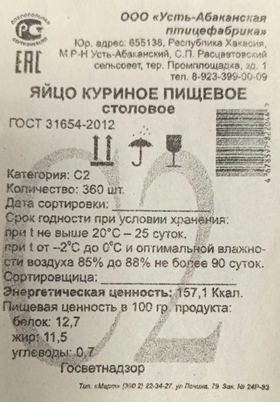 Яйцо куриное Усть-Абаканская птицефабрика С2, 360шт