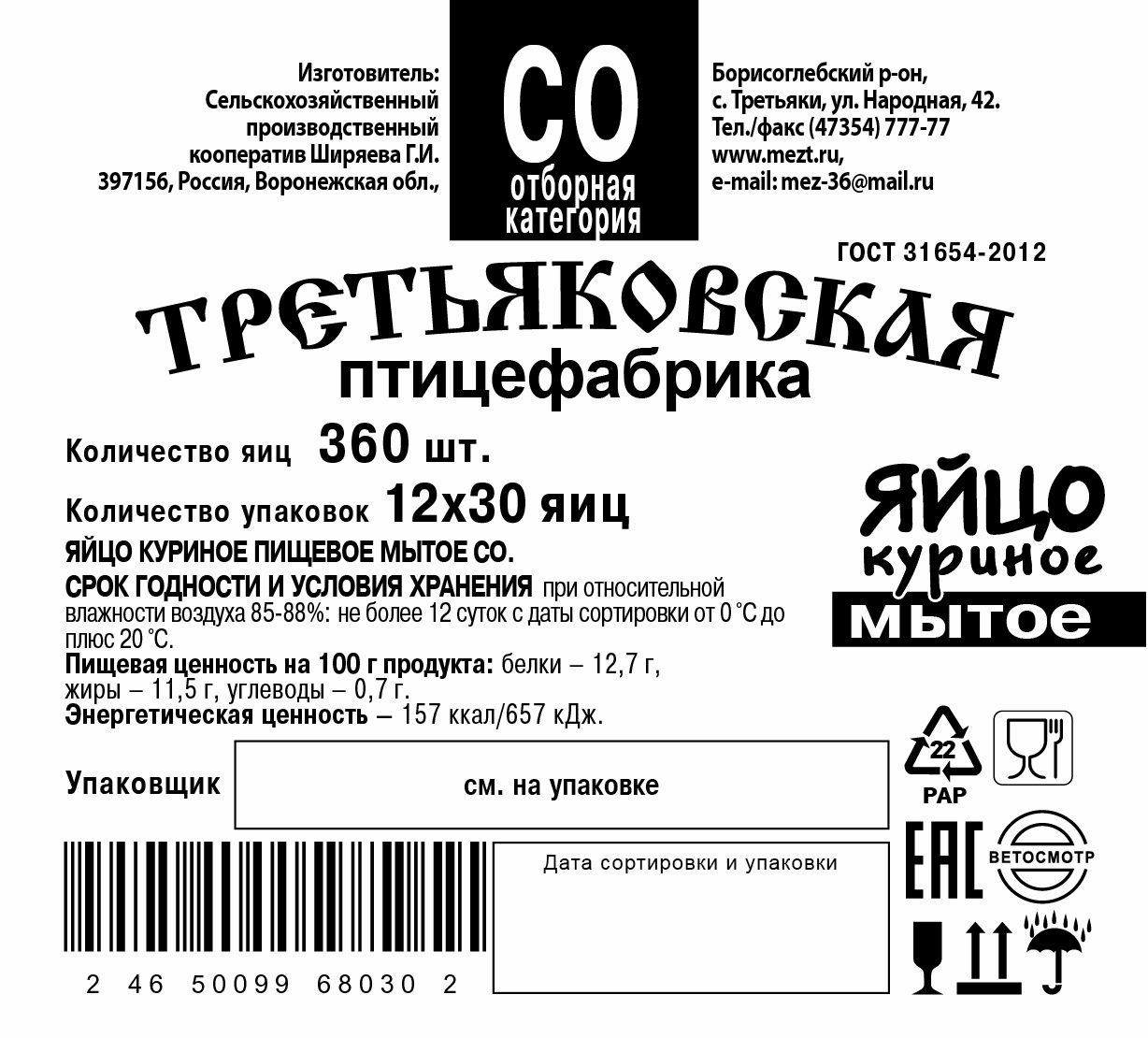Яйцо куриное Третьяковская ПФ мытое С0, 360шт