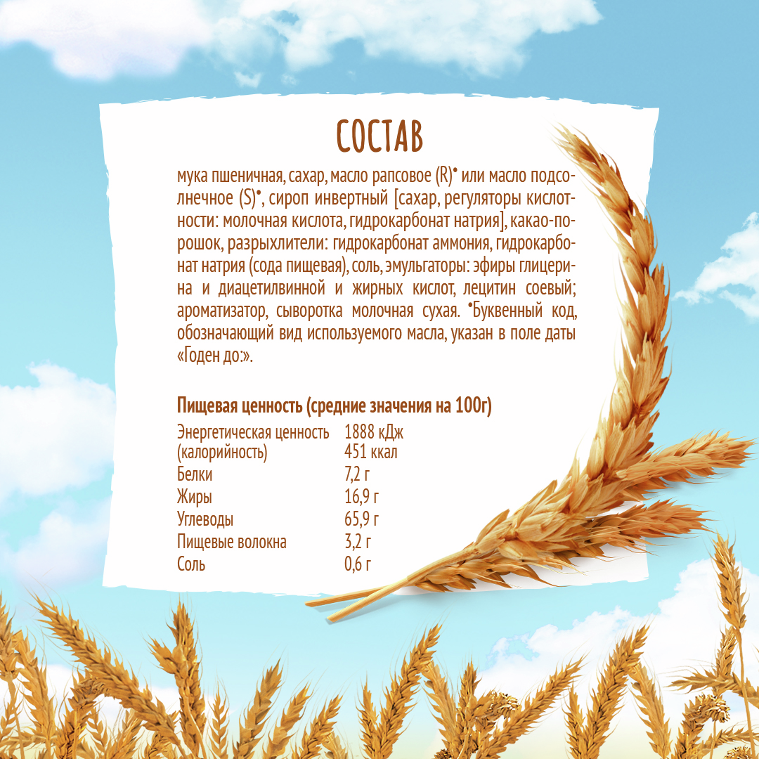 Мука пшеничная, сахар, масло растительное, сироп инвертный (сахар, регуляторы кислотности: молочная кислота, гидрокарбонат натрия), какао-порошок, разрыхлители: гидрокарбонат аммония, гидрокарбонат натрия (сода пищевая); соль, меланж яичный сухой, эмульгаторы: эфиры глицерина и диацетилвинной и жирных кислот, лецитин соевый; ароматизатор, сыворотка молочная сухая.