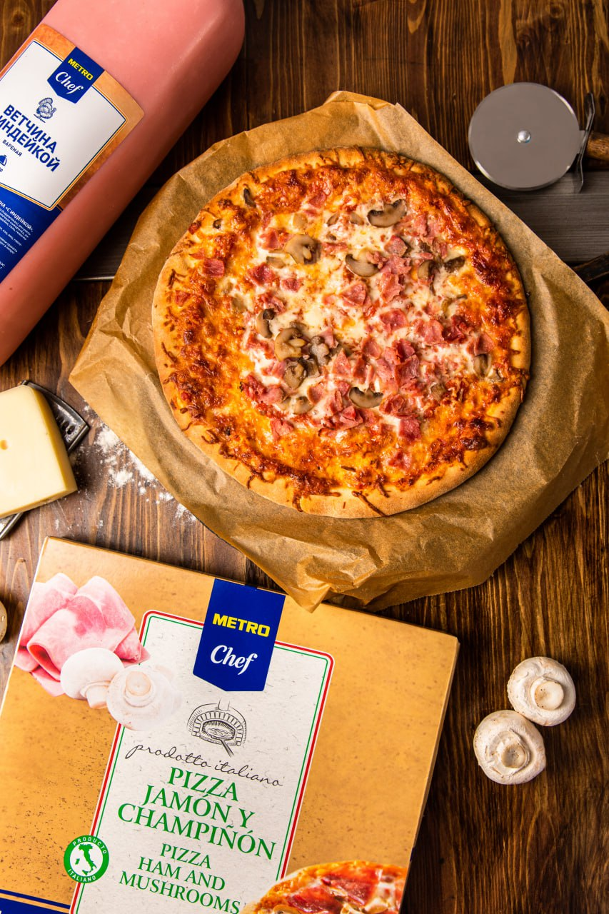 METRO Chef Пицца Ветчина и грибы замороженная 27см, 365г отличается тонким тестом с нежной начинкой и насыщенным ярким вкусом.