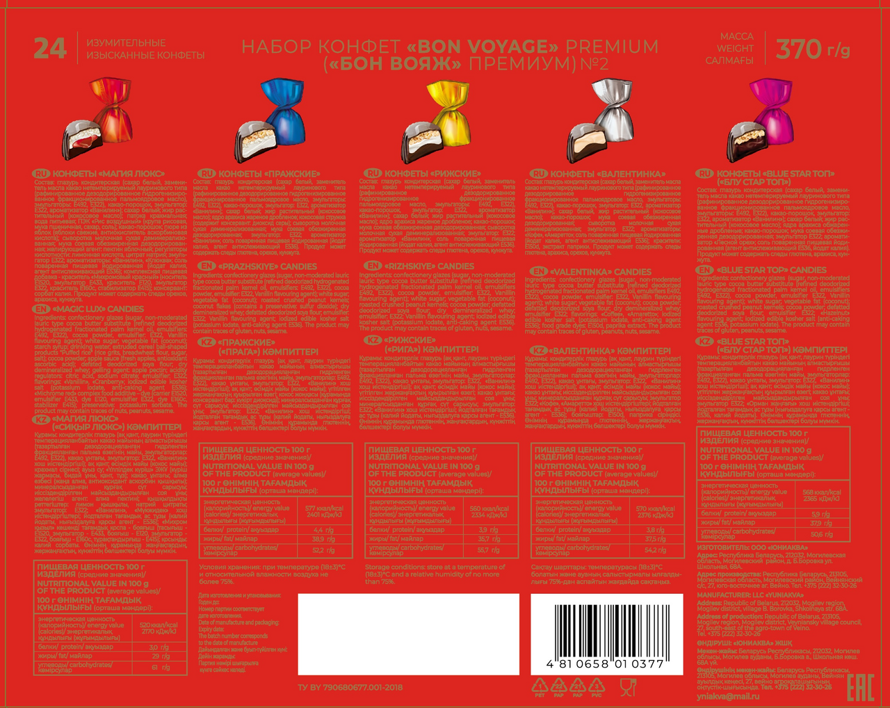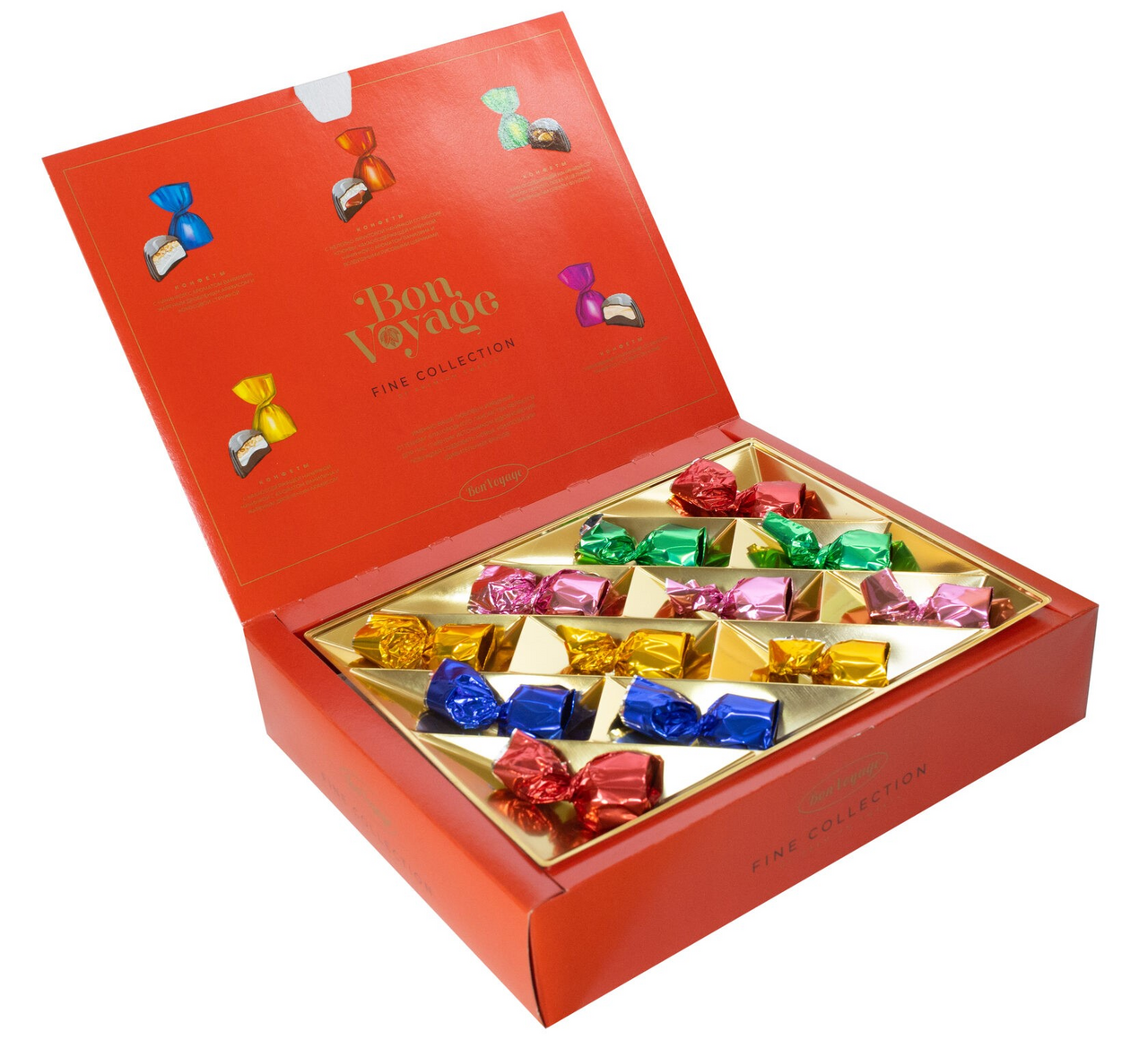 Ассорти конфет на любой самый взыскательный вкус: желейно-фруктовые, сливочные, пралиновые в сочетании с орехами, кофе, клюквой, кокосовой стружкой. Упаковка - готовый презент для любого повода. Вы не только насладитесь вкусом, но и получите эстетическое удовольствие. Состав набора из 24 конфет: Магия Топ - с желейно-фруктовой начинкой со вкусом клюквы, какаосодержащей начинкой, начинкой с ароматом ванилина и воздушными рисовыми шариками; Пражские - с нежной сливочной начинкой со вкусом ванили и пломбира в комбинации с золотистым арахисом и воздушной кокосовой стружкой; Рижские - конфеты с традиционной темной пралиновой начинкой в сочетании с нежной ванильно-сливочной начинкой в гармонии с золотистым, дробленным обжаренным арахисом; Валентинка Топ- конфеты с двойной начинкой Амаретто - Кофе; Фон Дук - конфеты в темной изысканной глазури, из коллекции конфет ЭЛИТ, с классическим сочетанием темной какао начинки с ядром фундука.