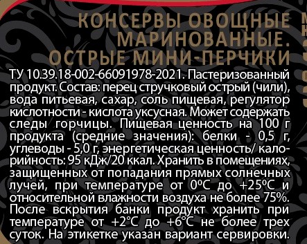 Мини-перчики чили маринованные - это острый и жгучий перчик чили, замаринованный в баночке. Этот продукт является максимально острым, но при этом идеальным дополнением ко многим блюдам. Натуральный, характерный аромат перца чили слегка смягчен уксусной составляющей, имеет яркий жгучий вкус и острый пряный запах. Может использоваться в качестве самостоятельной закуски, а также станет незаменимым ингредиентом для придания остроты при приготовлении многочисленным блюд. Также маринованный перец чили используется при создании острых соусов. Отличаются выразительным вкусом. Такой продукт можно подавать в сочетании с жареным и тушеным мясом, кебабами, добавлять в салаты и бутерброды. Умеренное употребление перца приносит пользу организму: стимулирует пищеварение, повышает аппетит, активизирует кровообращение, укрепляет иммунитет.