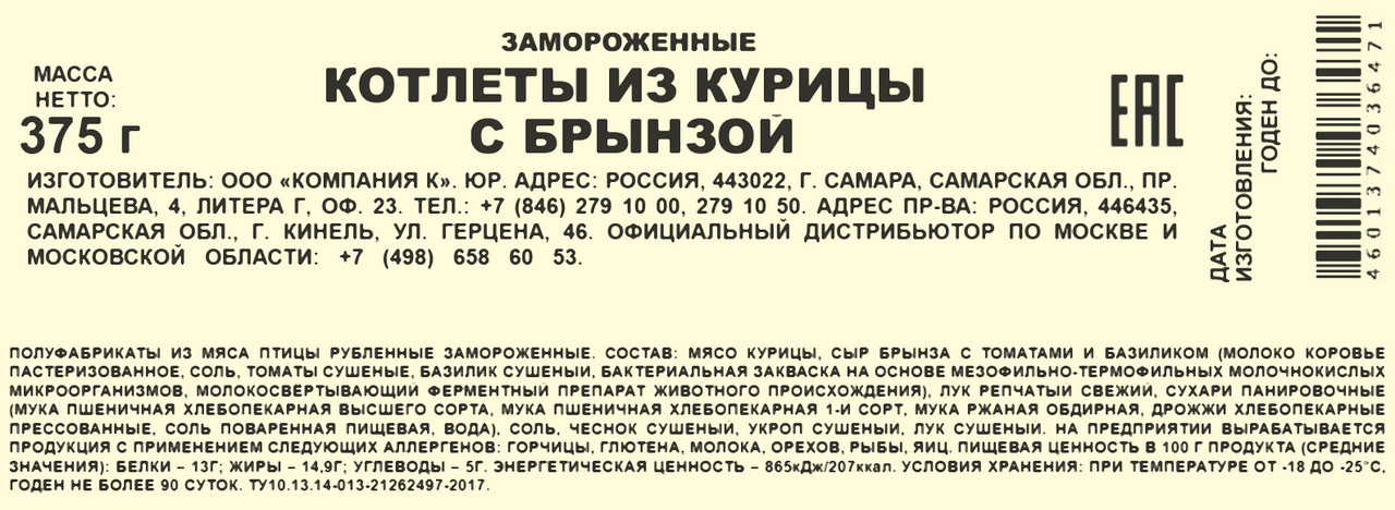 Мясо курицы, сыр Брынза с томатами и базиликом (молоко коровье пастеризованное, соль, томаты сушёные, базилик сушёный, бактериальная закваска на основе мезофильно-термофильных молочнокислых микроорганизмов, молокосвертывающий ферментный препарат животного происхождения), лук репчатый свежий, сухари панировочные (мука пшеничная хлебопекарная высшего сорта, мука пшеничная хлебопекарная 1-й сорт, мука ржаная обдирная, дрожжи хлебопекарные прессованные, соль поваренная пищевая, вода), соль, чеснок сушёный, укроп сушёный, лук сушёный.