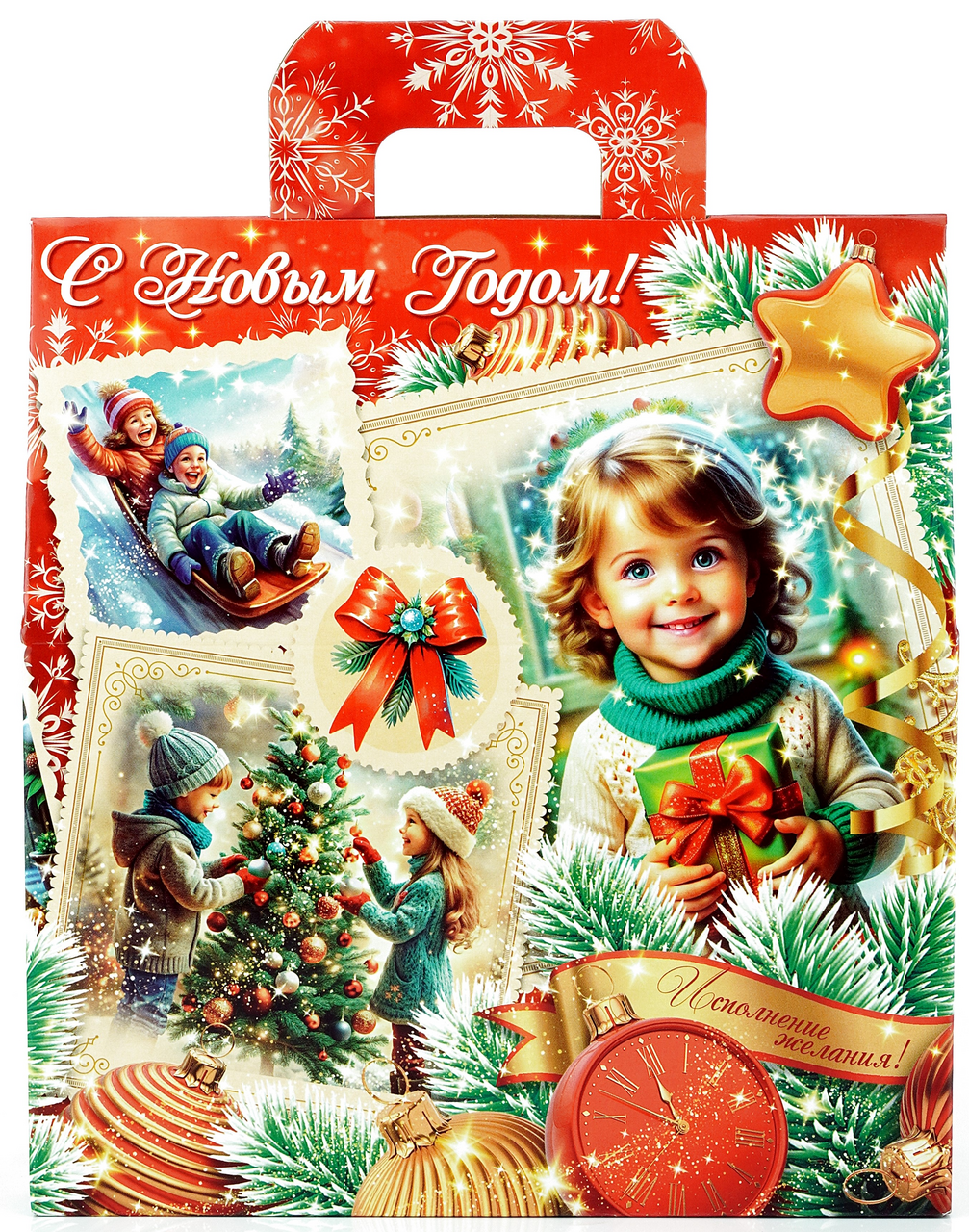 Сладкий набор, МосУпак, Подарок Золотое время - 376гр, содержит кондитерские изделия кондитерских фабрик Невский кондитер, Объединенные кондитеры, КДВ, Коломенское поле. Новогодний коллаж. Сюжет полный тайны и ожидания. Умиляющие образы. Такой подарок принесет ребенку счастье и улыбку. Кондитерские изделия упакованы в отдельный пластиковый пакет, который находится внутри подарочной картонной коробки.