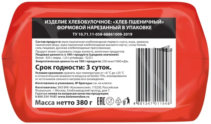 Хлеб пшеничный Коломенский формовой нарезка, 380г