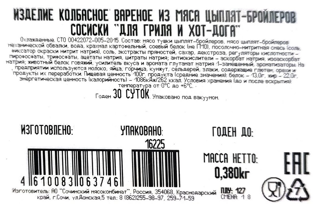 Сосиски из мяса цыпленка-бройлера Сочинский МК для гриля и хот-догов, 380г