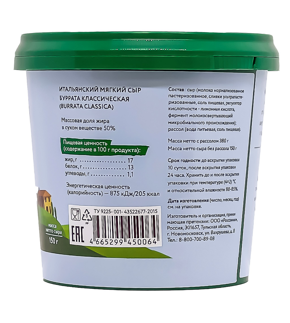 Молоко нормализованное пастеризованное, сливки питьевые ультрапастеризованные, соль пищевая, фермент молокосвёртывающий микробиального происхождения; регулятор кислотности-лимонная кислота, Рассол: вода питьевая, соль пищевая.