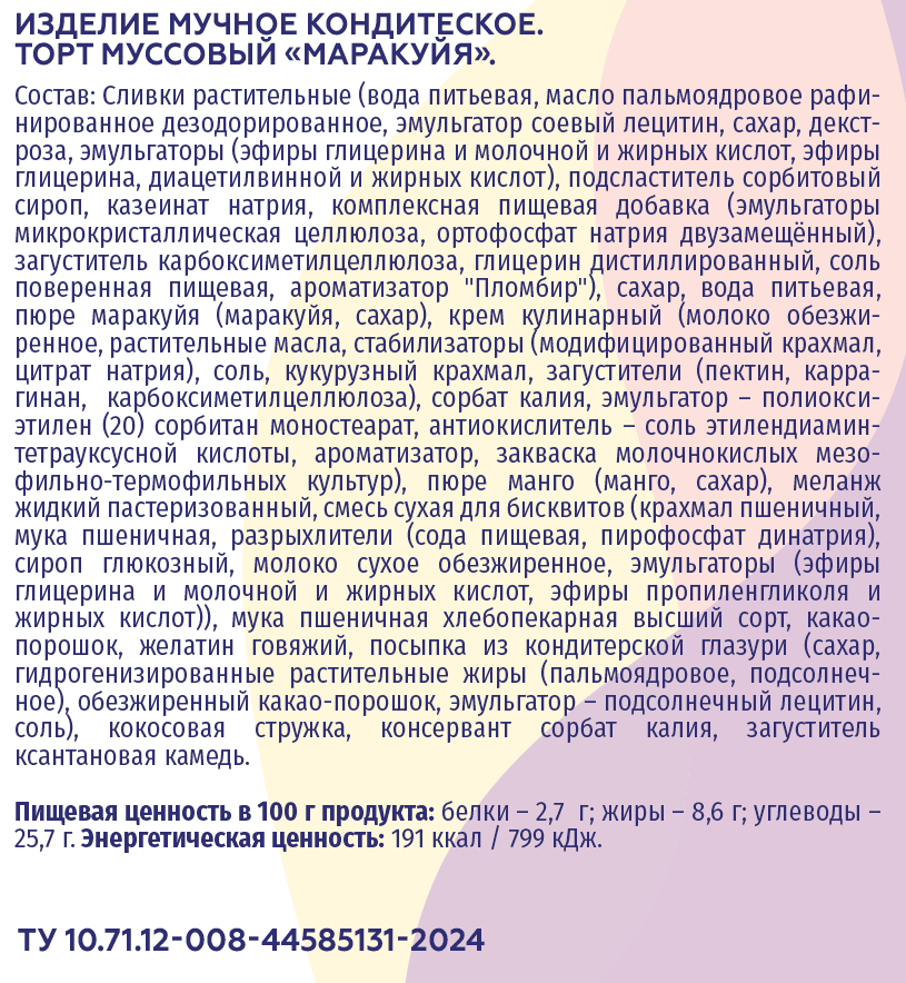 Сливки растительные (вода питьевая, масло пальмоядровое рафинированное дезодорированное, эмульгатор соевый лецитин, сахар, декстроза, эмульгаторы (эфиры глицерина и молочной и жирных кислот, эфиры глицерина, диацетилвинной и жирных кислот), подсластитель сорбитовый сироп, казеинат натрия, комплексная пищевая добавка (эмульгаторы микрокристаллическая целлюлоза, ортофосфат натрия двузамещенный), загуститель карбоксиметилцеллюлоза, глицерин дистиллированный, соль поваренная пищевая, ароматизатор Пломбир), сахар, вода питьевая, пюре маракуйя (маракуйя, сахар), крем кулинарный (молоко обезжиренное, растительные масла, стабилизаторы (модифицированный крахмал, цитрат натрия), соль, кукурузный крахмал, загустители (пектин, каррагинан, карбоксиметилцеллюлоза), сорбат калия, эмульгатор — полиоксиэтилен (20) сорбитан моностеарат, антиокислитель — соль этилендиаминтетрауксусной кислоты, ароматизатор, закваска молочнокислых мезофильно-термофильных культур), пюре манго (манго, сахар), меланж жидкий пастеризованный, смесь сухая для бисквитов (крахмал пшеничный, мука пшеничная, разрыхлители (сода пищевая, пирофосфат динатрия), сироп глюкозный, молоко сухое обезжиренное, эмульгаторы (эфиры глицерина и молочной и жирных кислот, эфиры пропиленгликоля и жирных кислот)), мука пшеничная хлебопекарная высшего сорта, какао-порошок, желатин говяжий, посыпка из кондитерской глазури (сахар, гидрогенизированные растительные жиры (пальмоядровое, подсолнечное), обезжиренный какао-порошок, эмульгатор подсолнечный лецитин, соль), кокосовая стружка, консервант сорбат калия, загуститель ксантановая камедь.