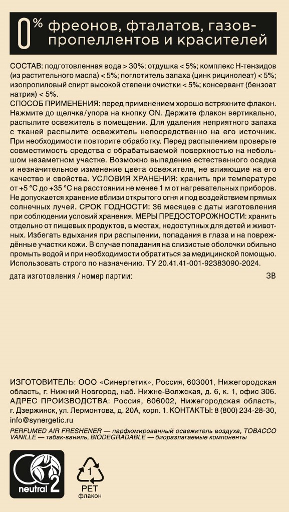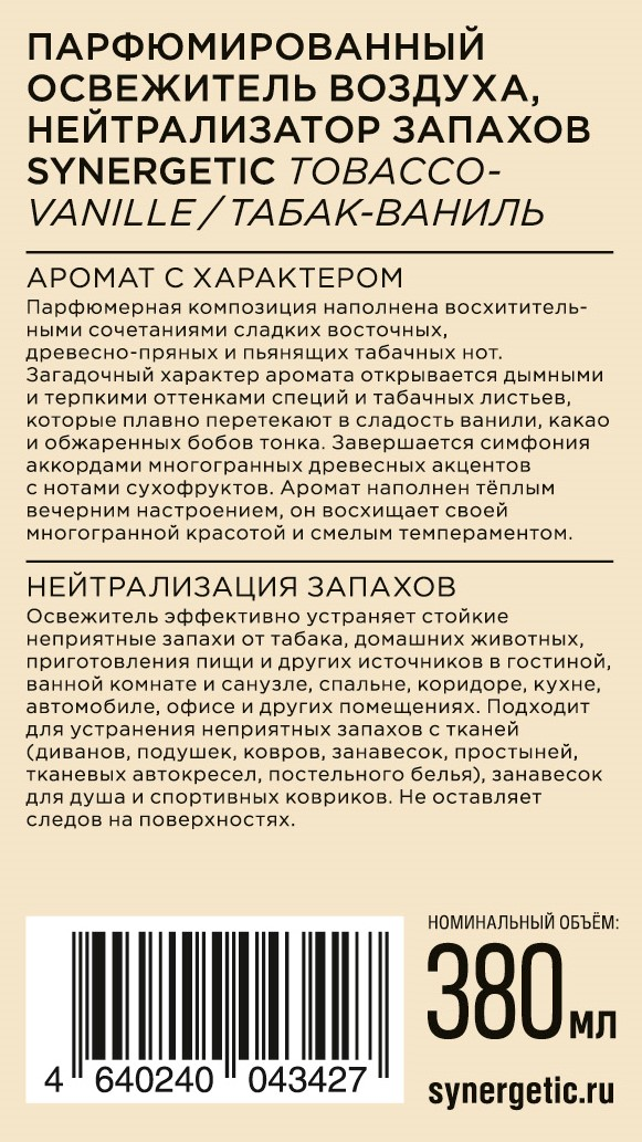 Освежитель воздуха парфюмированный Synergetic Табак-ваниль, 380мл