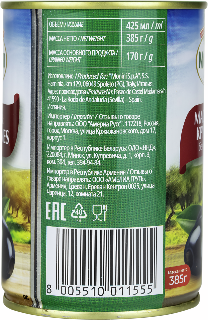 Маслины крупные без косточки от бренда Monini - полезный и питательный продукт: источник клетчатки, витамина Е, железа, а также маслины имеют высокое содержание ненасыщенных жиров. Отсутствие рассола или каких-либо других консервирующих жидкостей, а также наличие удобной упаковки вида открыть и закрыть позволяет насладиться изысканным вкусом сразу после вскрытия упаковки. Новая линия столовых оливок из лучших итальянских сортов, каждый со своим неповторимым вкусом и высочайшего качества. Крупные, умеренно солёные маслины без косточек. Обладают сочной мякотью и насыщенным маслянисто-сливочным вкусом. Станут настоящим украшением закусочной тарелки, подойдут для выпекания хрустящей домашней чиабатты, приготовления салатов и деликатесных брускетт.