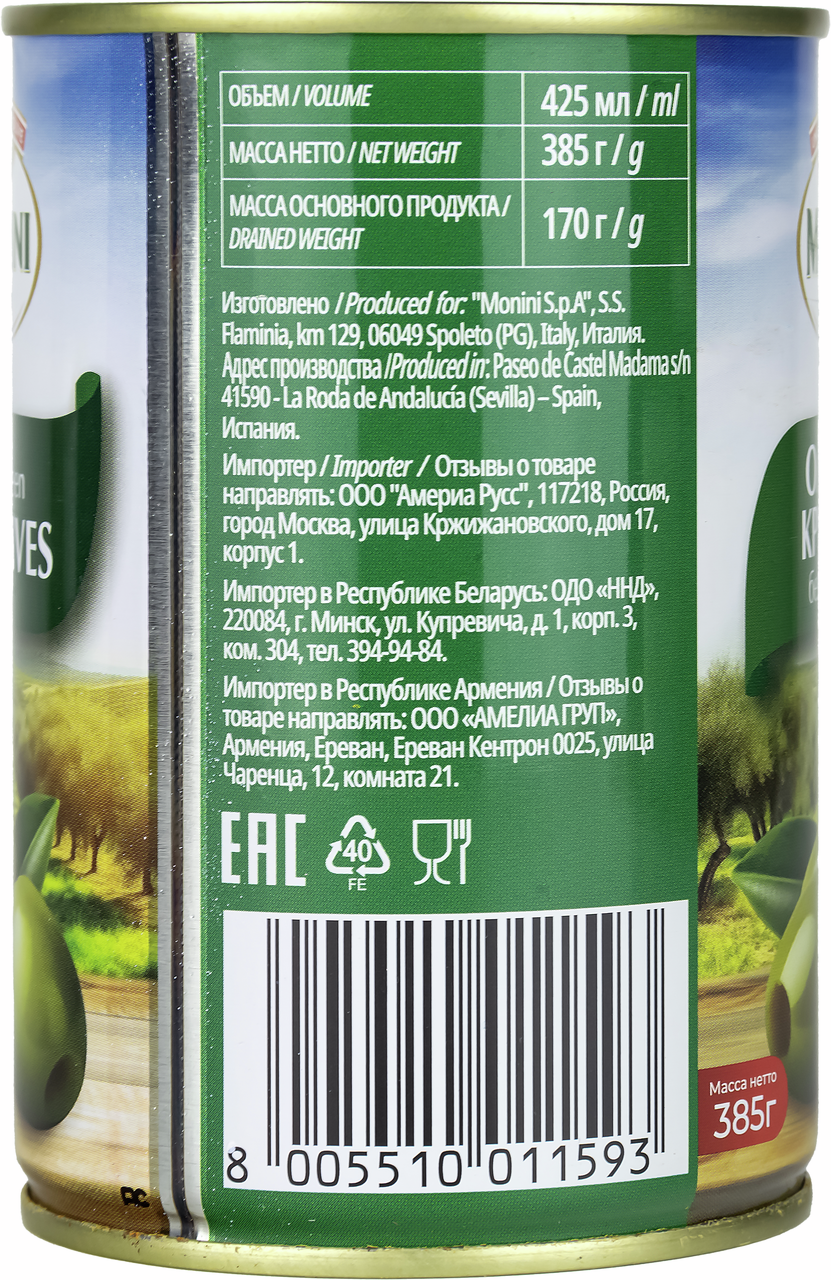 Оливки крупные без косточки от бренда Monini - полезный и питательный продукт: источник клетчатки, витамина Е, железа, а также маслины имеют высокое содержание ненасыщенных жиров. Оливки не только самостоятельный продукт, они используются в приготовлении многих блюд, салатов и выпечки. Например, станут отличной начинкой для мяса или можно испечь оливковый багет. Не обойтись без оливок при приготовлении грибной или сборной солянки, а еще их можно использовать для традиционного в русской кухне рассольника. В натуральных оливках содержатся практически все витамины и микроэлементы, необходимые человеку. Можно сказать, что это универсальное средство, которое улучшают состояние волос и кожи, общее состояние организма; благоприятно влияют на суставы, снижают риск развития онкологических заболеваний и являются антиоксидантами; способствуют выведению токсинов; защищают сердечно-сосудистую систему, помогают поддерживать мышечный тонус, укрепляют костную и соединительную ткани; защищает клетки от раннего старения и благотворно влияет на зрение. Хорошо сочетаются оливки с теплым белым хлебом. Можно смело экспериментировать, например, сделать оливковую пасту с добавлением масла и специй. Будучи ингредиентами средиземноморской кухни, оливки используют в греческом салате, салате с тунцом, салате с мидиями и помидорами. Зеленые оливки хорошо сочетаются с морепродуктами, помидорами, мягкими белыми сырами.