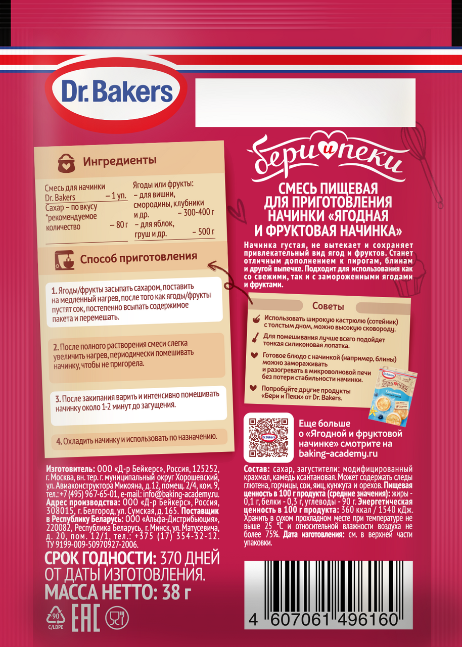 Смесь пищевая Dr.Bakers фруктовая и ягодная начинка, 38г