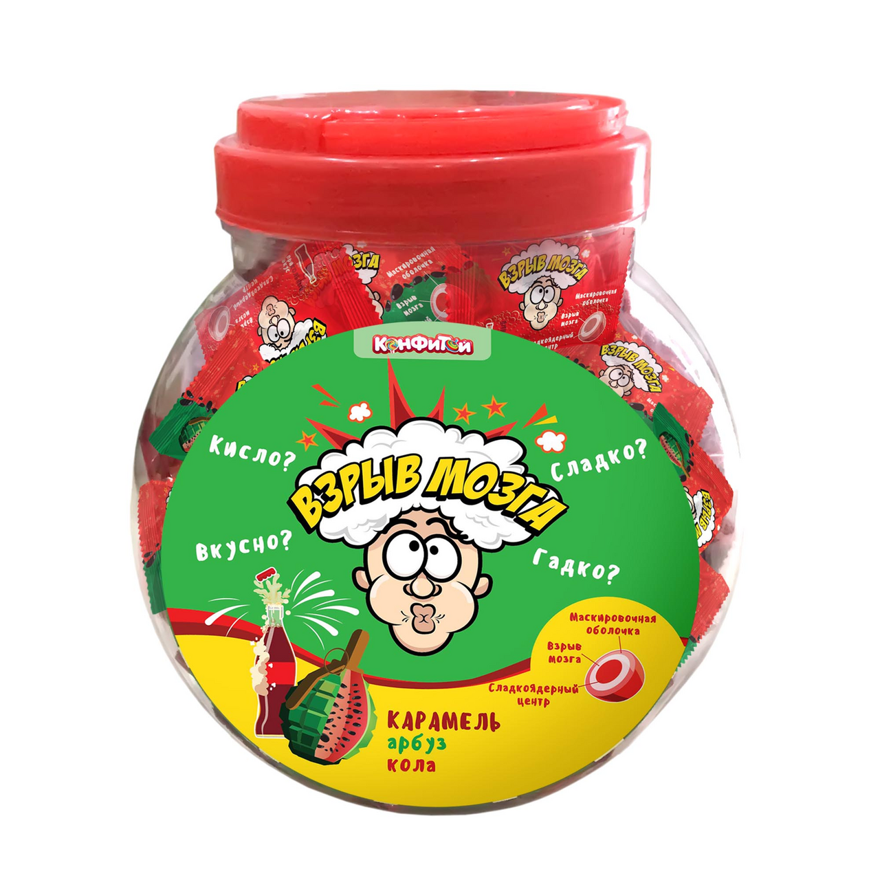 Встречайте новый супер вкус колы и арбуза! Карамель с невероятным многослойным вкусом! Сладкая оболочка, супер кислая прослойка и вкусный сладкий центр. Настоящий взрыв мозга! Популярные вкусы карамели с кислым слоем теперь в новом формате упаковки – пластиковой банке! Покупатель сможет приобретать любимую карамель поштучно – каждая конфетка имеет штрих-код. Банку удобно размещать в прикассовой зоне. Особая форма со скошенной боковиной делает ее устойчивой. Такой формат упаковки особенно востребован в небольших торговых точках, так как выполняет функцию торгового оборудования.
