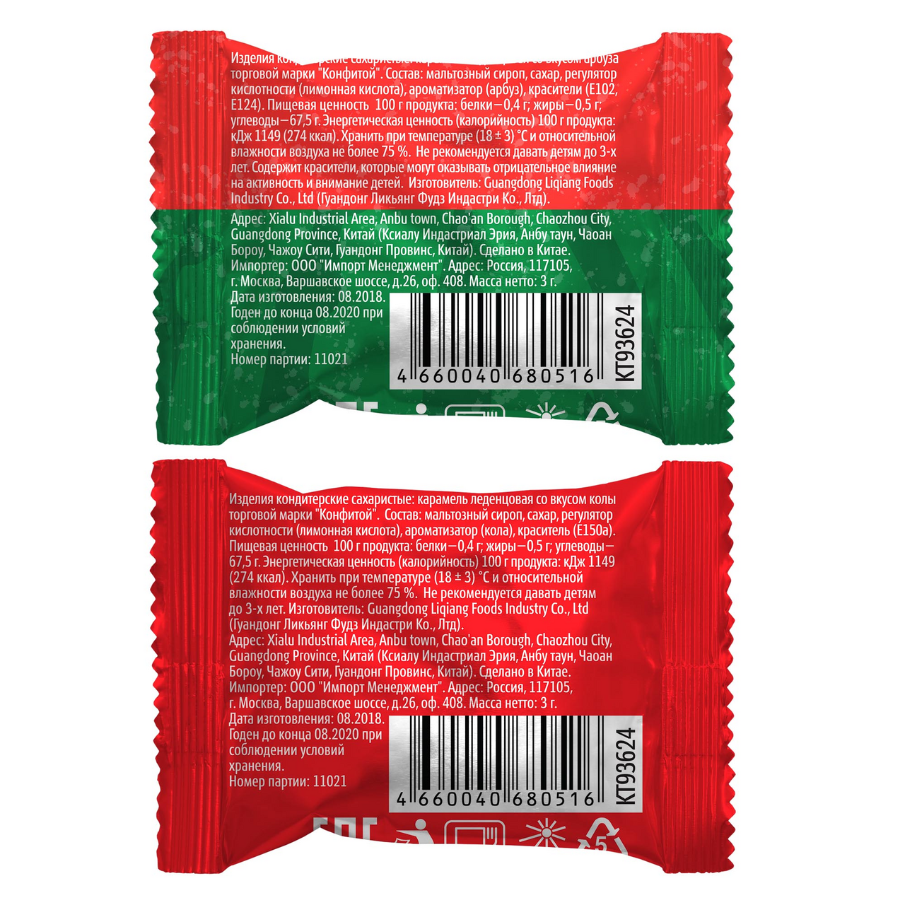 Состав колы: мальтозный сироп, сахар, регулятор кислотности (лимонная кислота), ароматизатор (кола), краситель (E150а). Состав арбуза: мальтозный сироп, сахар, регулятор кислотности (лимонная кислота), ароматизатор (арбуз), красители (E102,E124).