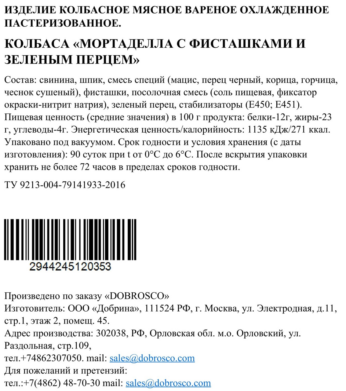 Это итальянская варёная колбаса, происходящая из Болоньи, регион Эмилия-Романья. Она имеет нежный вкус без примеси копчения, а вкрапления зелёного перца и фисташек добавляют пикантности. Аутентичный состав исключает наличие воды, крахмалла или соевого белка в настоящей Мортаделле от Dobrosco.
