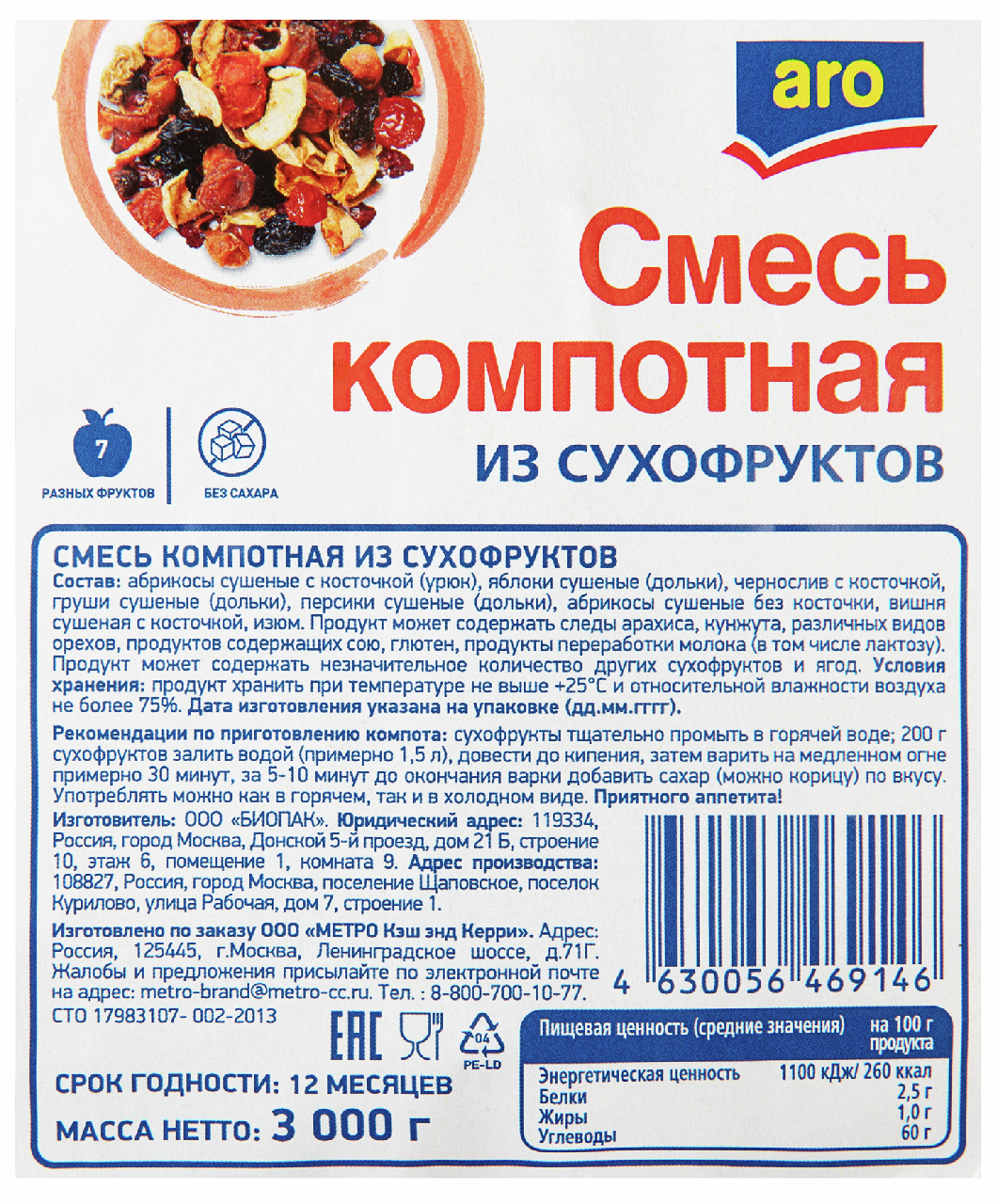 Компотная смесь aro из сухофруктов, 3 кг – идеальный вариант для приготовления вкусных и полезных компотов, от которых не откажутся даже дети. Состав продукта полностью натуральный и безопасный. За счет щадящей сушки в фруктах и ягодах, что собраны в эту смесь, сохраняются все полезные витамины и минералы. Готовить компот из такого продукта легко и просто. Поставьте необходимое количество воды на печь и закипятите ее. Предварительно промытую и слегка обсушенную смесь после закипания воды положите в кастрюлю и доведите до повторного закипания. Далее в течение 5-7 минут дайте компоту медленно покипеть. Чтобы вкус и аромат готового напитка получился более насыщенным и интересным, в компот можно положить палочку корицы, немного гвоздики, мускатный орех и кардамон. По вкусу также можно добавить обычный или тростниковый сахар или мед. Компот из такой фруктовой смеси бренда aro – отличная альтернатива сладкой газировке и прочим высококалорийным напиткам. Тем более он не просто вкусный, но и полезный. Продукт поставляется в упаковке весом 3 кг. Этого хватит на длительное время. После вскрытия пакета смесь рекомендуется пересыпать в более герметичную тару. aro – это собственная торговая марка сети гипермаркетов METRO, под которым выпускается широкий ассортимент различных бытовых товаров для дома, косметических средств и продуктов питания для всей семьи. К главным преимуществам бренда можно отнести: тщательный отбор поставщиков, грамотно налаженный производственный цикл, соответствие с высокими стандартами. Вся производимая продукция фасуется в прочные упаковки, удобные как для хранения, так и для транспортировки.