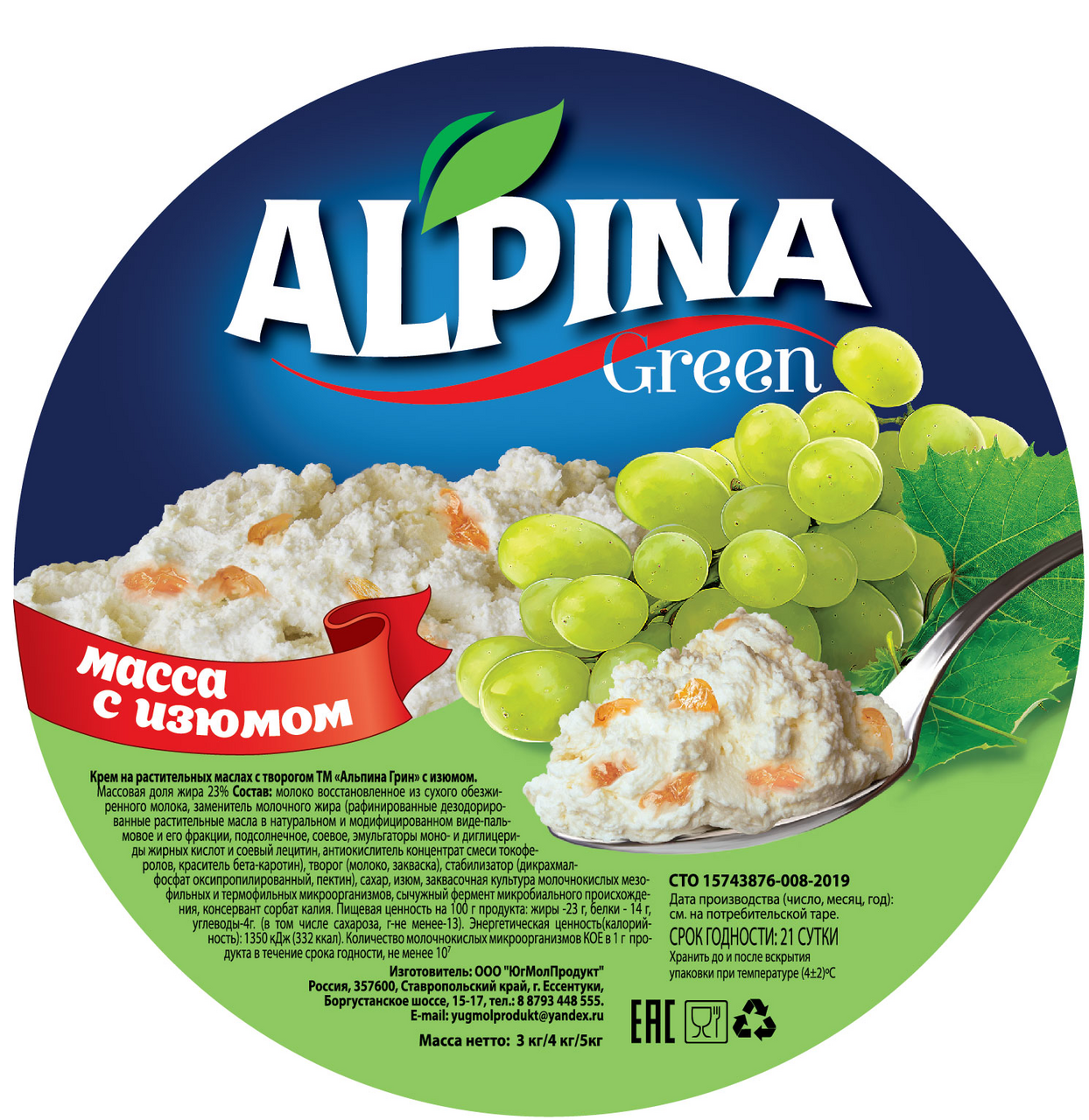 Продукт молоко-растительный Alpinagreen на творожной закваске с изюмом, 3кг