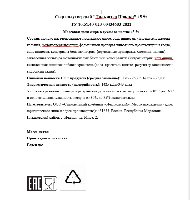 Молоко пастеризованное нормализованное, соль пищевая, уплотнитель хлорид кальция, молокосвертывающий ферментный препарат животного происхождения вода, соль пищевая, консервант бензоат натрия, ферментные препараты: химозин, пепсин, заквасочная культура молочнокислых бактерий, консерванты нитрат натрия, натамицин, комплексная пищевая добавка краситель вода, краситель аннато, регулятор кислотности гидроксид калия.