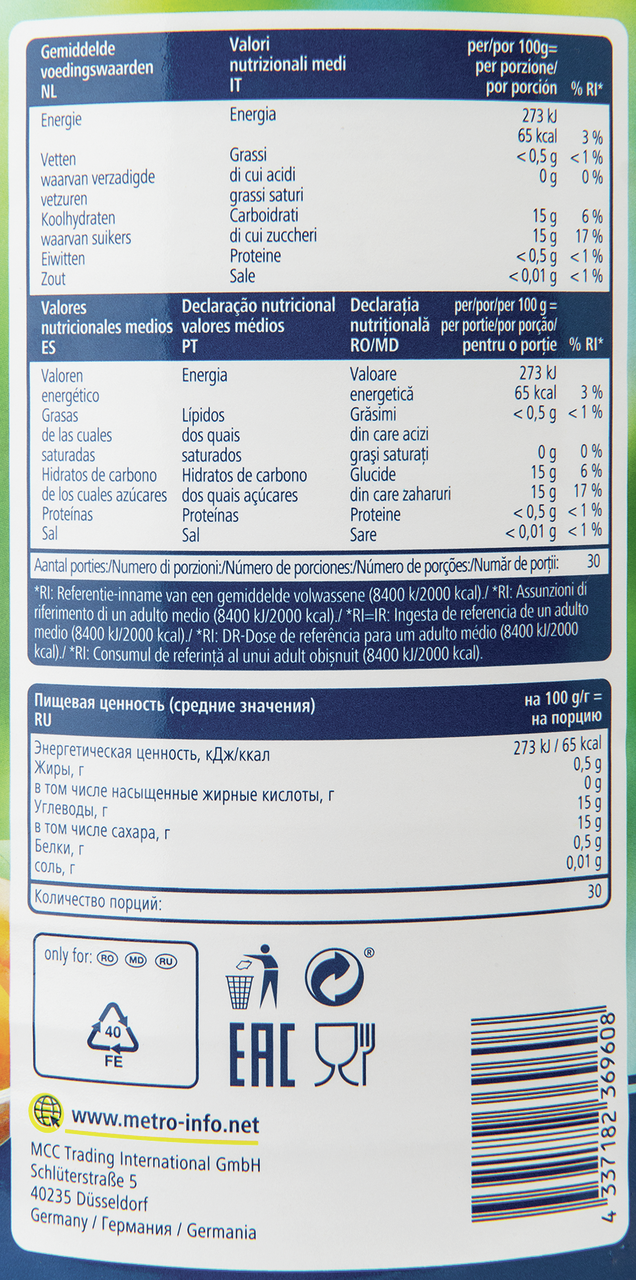 Metro Chef Коктейль тропический в сиропе, 3кг – это вкусный и полезный продукт. В составе присутствуют экзотические фрукты (ананас, гуава и два вида папайи, желтая и красная). Спелые плоды порезаны на одинаковые кубики, что удобно. Заправка состоит из натурального сока ананаса и папайи. В качестве подсластителя используется сахарный сироп. Лимонная кислота помогает сохранить свежесть фруктов. В составе только натуральные ингредиенты, отсутствуют искусственные красители, консерванты и ГМО. Банка плотно заполнена. На крышке имеется ключ, что удобно. Тропический коктейль обладает ярким вкусом. Его можно употреблять как самостоятельный десерт или использовать для приготовления различных блюд. Это полезное лакомство: в экзотических фруктах содержится большое количество витаминов, микро- и макроэлементов, жирных кислот и других веществ, необходимых организму. Тропические плоды даже в сахарном сиропе можно употреблять во время диет (калорийность продукта всего 65 ккал). Кусочки фруктов можно использовать для приготовления самых разных десертов. Они украсят вкус мороженого, их добавляют в каши, творог, начинки для тортов и пирогов. Яркий вкус отлично сочет��ется с кремами. На их основе можно готовить муссы, суфле, желе и другие сладости. Фруктовые кубики могут стать элементом декора. На их основе можно приготовить освежающие коктейли. Консервированный сок также добавляют в напитки или используют в качестве пропитки для коржей. Экзотические плоды подходят для приготовления фруктовых салатов. Их также добавляют в блюда азиатской кухни (например, в салаты). Интересное сочетание получается с морепродуктами, рыбой и мясом.