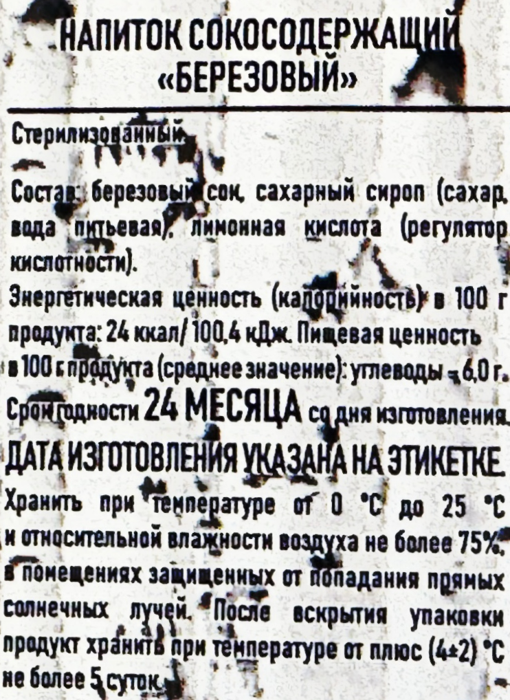 Березовый сок из тихой березовой рощи. Березовый сок содержит: витамины группы В, витамин С, калий, никель, кальций, железо, фитонциды и органические кислоты. Натуральный сок.
