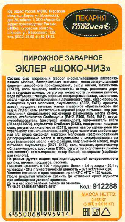 Сыр творожный творог нормализованное пастеризованное молоко, бактериальная закваска, молокосвертывающий фермент микробного происхождения, сыры мягкие, загуститель Е1422, соль пищевая, стабилизаторы камедь рожкового дерева и гауровая камедь, регулятор кислотности лимонная кислота, вода питьевая; глазурь жировая кондитерская сахар, заменитель масла-какао нетемперируемый лауринового типа, какао-порошок, сыворотка сухая молочная, эмульгаторы Е322, Е476, ароматизатор; продукты яичные; масло сливочное Крестьянское высший сорт м. д. ж. 72,5% ; крем растительно-жировой вода питьевая, жир растительный специального назначения заменитель масла какао, сахар, стабилизатор Стабимульс Е412, Е460, Е466, Е481, структурообразователь декстроза моногидрат, удерживатель влаги Неосорб, эмульгатор Стабисол Е435, поваренная пищевая соль, регулятор кислотности Е331, ароматизатор идентичный натуральному ванильно-сливочный; мука пшеничная хлебопекарная высший сорт; пудра сахарная; маргарин молочный рафинированные дезодорированные масла в натуральном и модифицированном виде пальмовое масло и его фракции, подсолнечное масло, вода питьевая, эмульгаторы Е471, Е475, соль пищевая, ароматизатор Сливки-молоко, краситель Е160а, регулятор кислотности лимонная кислота; какао-порошок; сахар белый; консервант сорбиновая кислота.