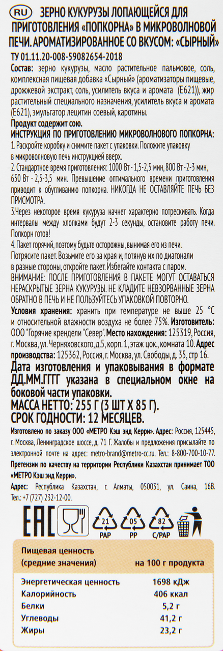 Крупные зерна кукурузы в бумажном пакете превращаются в воздушную закуску со вкусом сыра всего за 2 минуты. Содержит исключительно натуральные ароматизаторы и соевое масло, богатое железом, цинком и витамином Е. Удобный бумажный пакет позволяет поджаривать кукурузу прямо в духовом шкафу или микроволновой печи. Продукт с приятным выразительным вкусом богат витаминами из группы В и клетчаткой, содержит природные антиоксиданты, натрий, кальций, фосфор, магний, цинк, железо и другие элементы. Он нормализует работу кишечника, замедляет процессы старения, улучшает состояние кожи и волос, активизирует обменные процессы, успокаивает нервы и поднимает настроение.