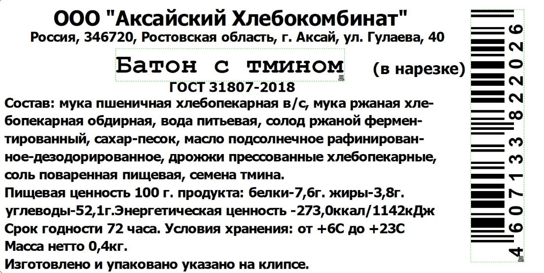 Мука пшеничная хлебопекарная первого сорта, мука ржаная обдирная хлебопекарная, вода питьевая, сахар-песок, масло подсолнечное рафинированное дезодорированное вымороженное высший сорт, соль поваренная пищевая, дрожжи прессованные хлебопекарные, тмин.