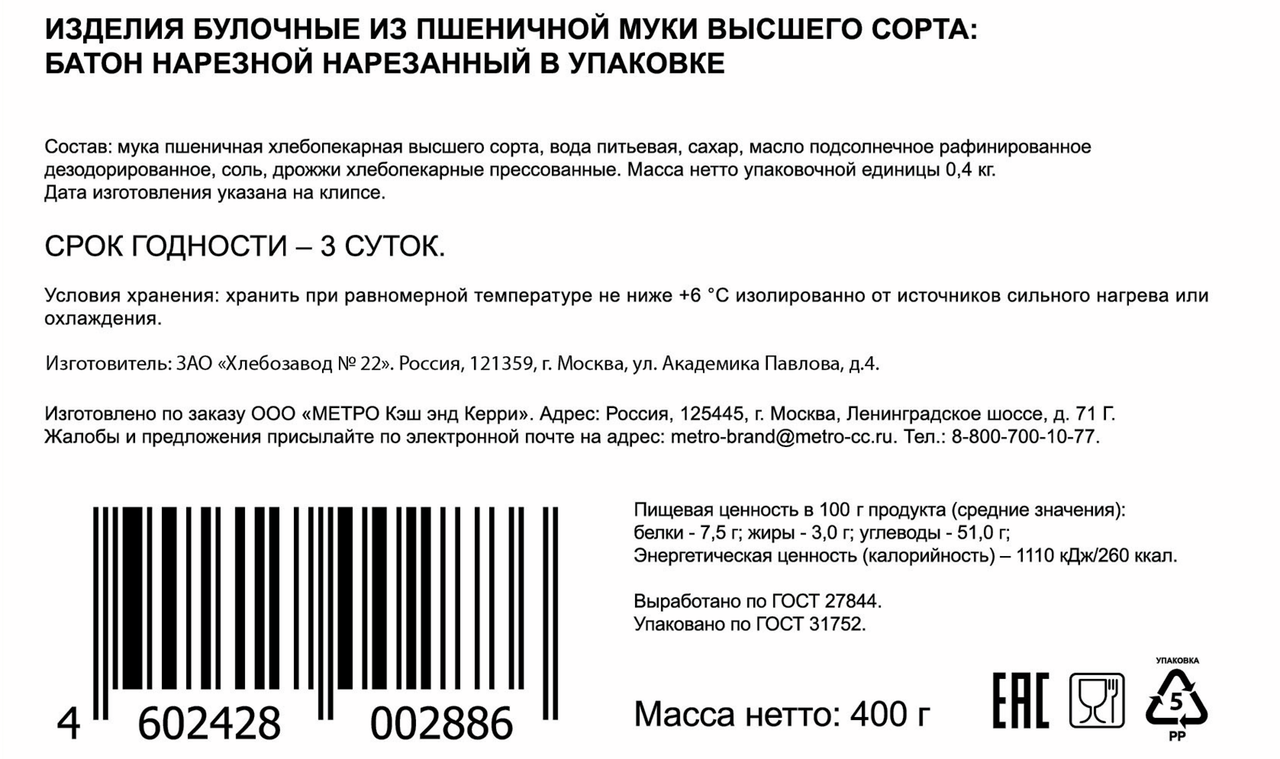 Классический батон из пшеничной муки высшего сорта с добавлением сухого молока и сахара. Благодаря промышленному производству компании Ярхлеб качество всегда остается стабильным. Румяная корочка, нежный мякиш, идеальная форма.