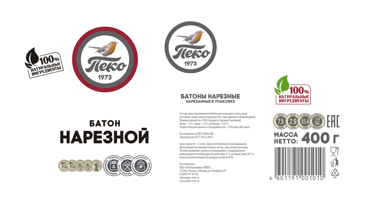 Сочный аппетитный хлеб. Он готовится по классическому рецепту из отборных ингредиентов. Кусочки этого ароматного батона буквально таят во рту и заряжают энергией на целый день. Продукт полностью соответствует ГОСТу.