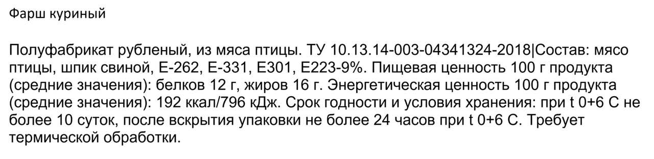 Мясо птицы, шпик свиной, Е262, Е331, Е 301, Е 223-9%.