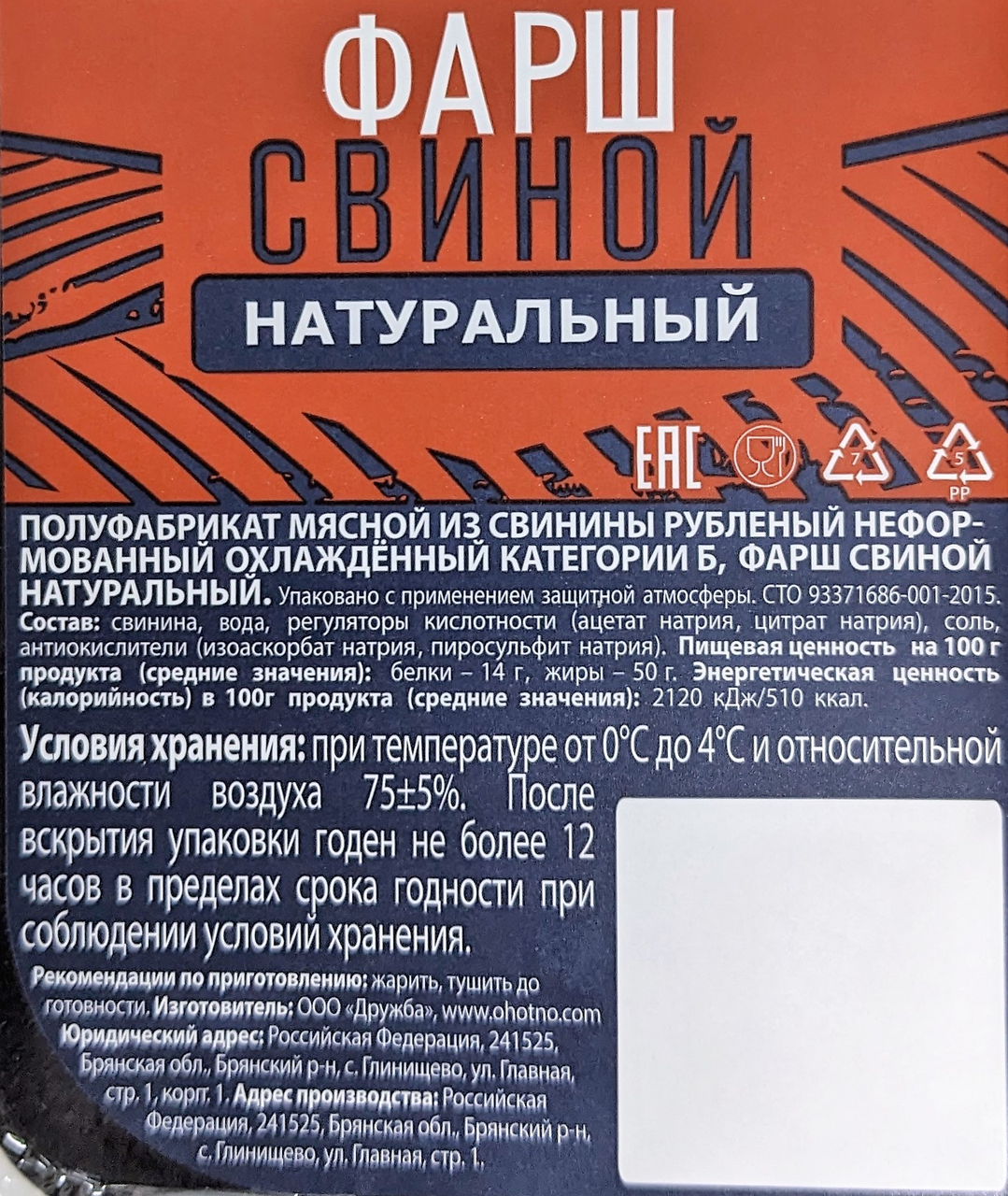 Фарш свиной Охотно Натуральный охлажденный, 400г
