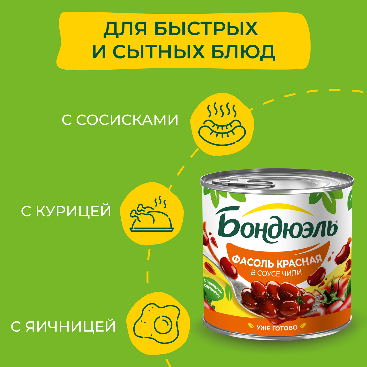 Красная фасоль в соусе "Чили" – самостоятельное дополнение к горячему. Пикантный соус придает яркости любому блюду и дополняет особый вкус красной фасоли, наполненной растительным белком. Теперь, даже если нет времени, вы можете быть уверены, что едите полноценно и сбалансированно — вам надо просто выложить фасоль из банки. А если добавить фасоль к яичнице и бекону, то получится традиционный английский завтрак — сытный и полезный, дающий организму необходимые белки, углеводы, клетчатку и железо.