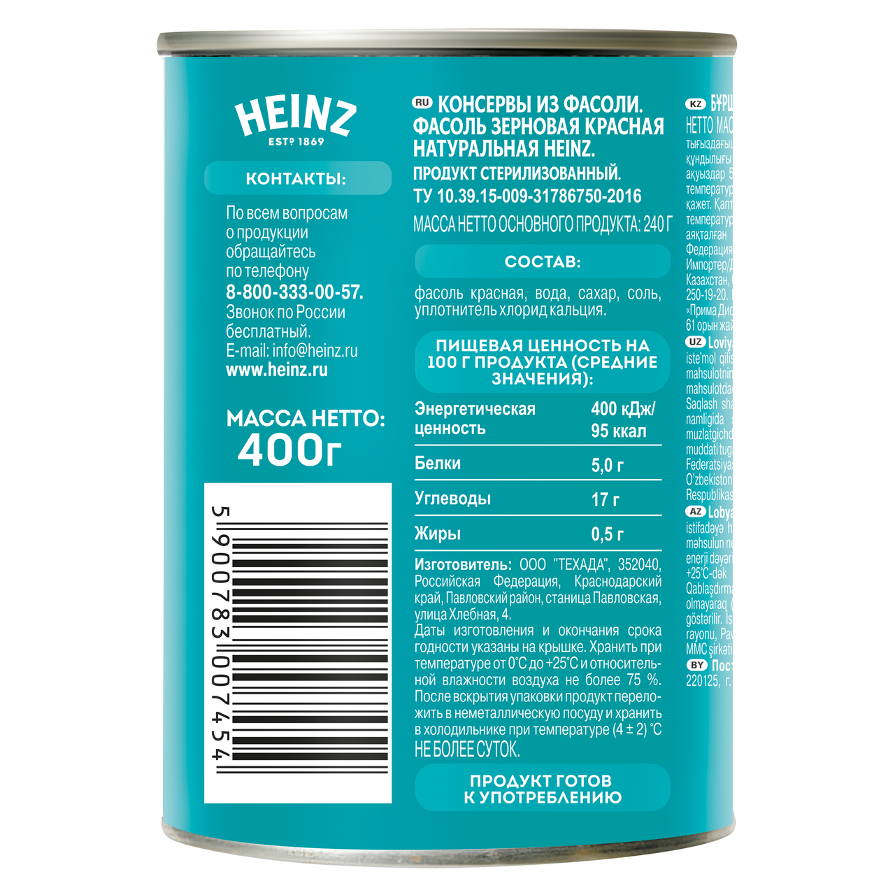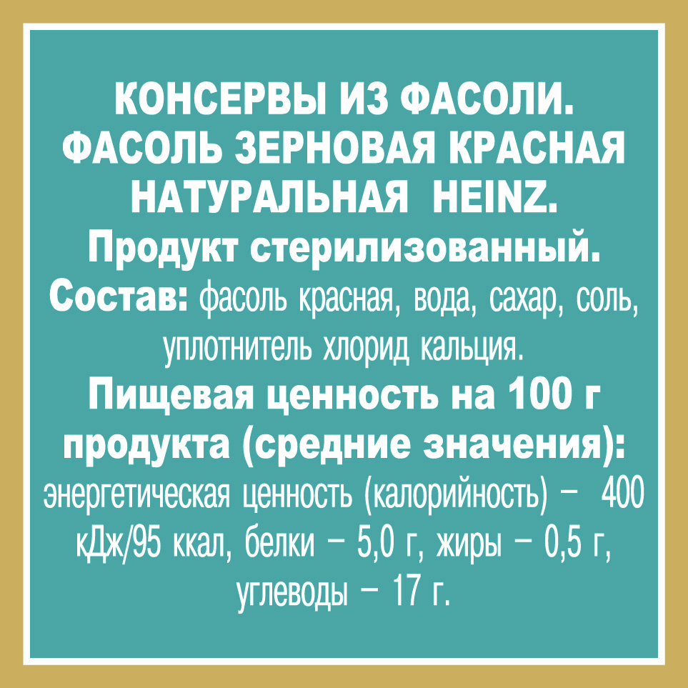 Фасоль Heinz красная, 400г.Консервы из фасоли.Фасоль зерновая красная натуральная. Стерилизованная.Масса нетто основного продукта 220г.Состав: фасоль зерновая красная, вода, соль,сахар.Пищевая ценность в 100г: белки 4,5г; углеводы 11,5г; жиры 0,5г.Энергетическая ценность в 100г: 70ккал/290кДж..Хранить при температуре от 0'C до +25'C и относительной влажности воздуха не более 75%.После вскрытия упаковки переложить в неметаллическую посуду и хранить в холодильнике не более суток.Срок годности: 24 месяца.