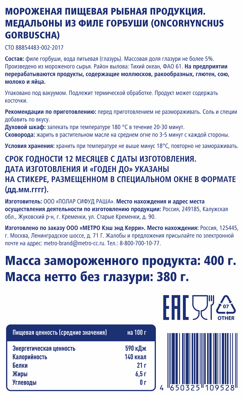 Медальоны из филе тихоокеанской горбуши изготовлены из тихоокеанских горбуш и не требуют разморозки перед приготовлением. А приготовить можно любым способом - как на сковороде, так и в духовке.