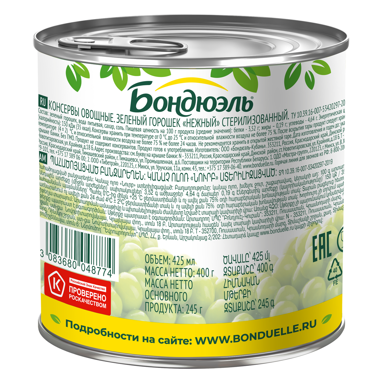 Горошек Бондюэль зеленый, 400г – сочный, нежный и изысканный продукт с оригинальным вкусом и тонким ароматом. Его можно добавить в овощной салат, дополнить им первые и вторые блюда. Особенно часто горошек используют в азиатских блюдах при приготовлении лапши. Салат из такого горошка в сочетании со свежей морковью и кунжутным маслом не оставит равнодушным даже самых взыскательных гурманов. В горошке много полезных для организма человека витаминов, макро- и микроэлементов. К тому же в нем мало калорий, что позволяет включать его в диетический рацион.