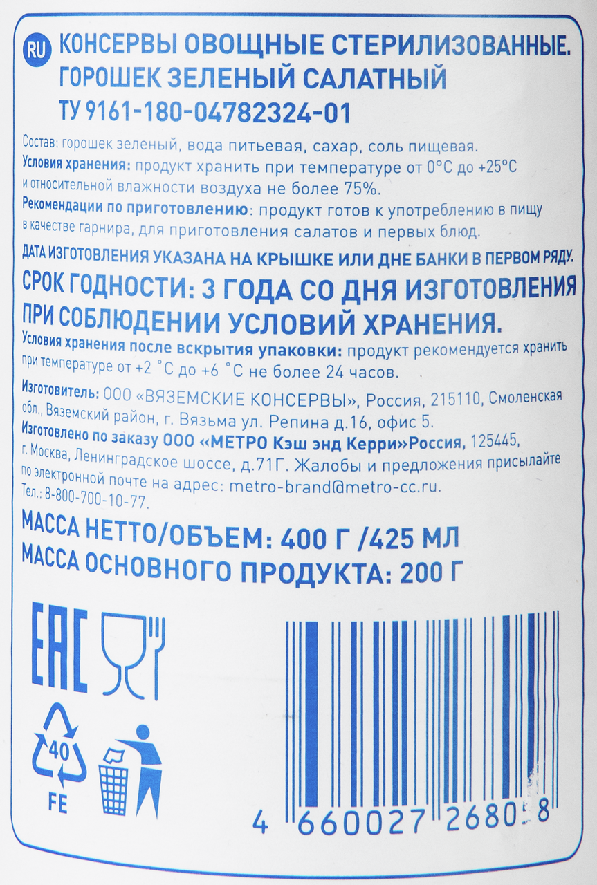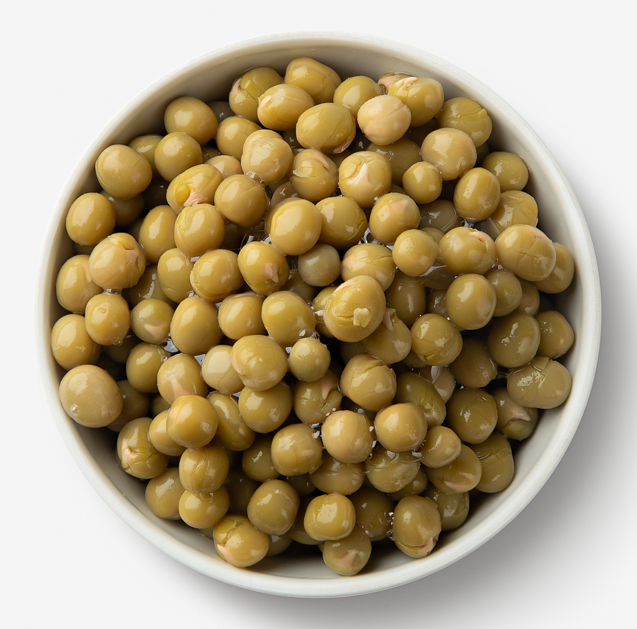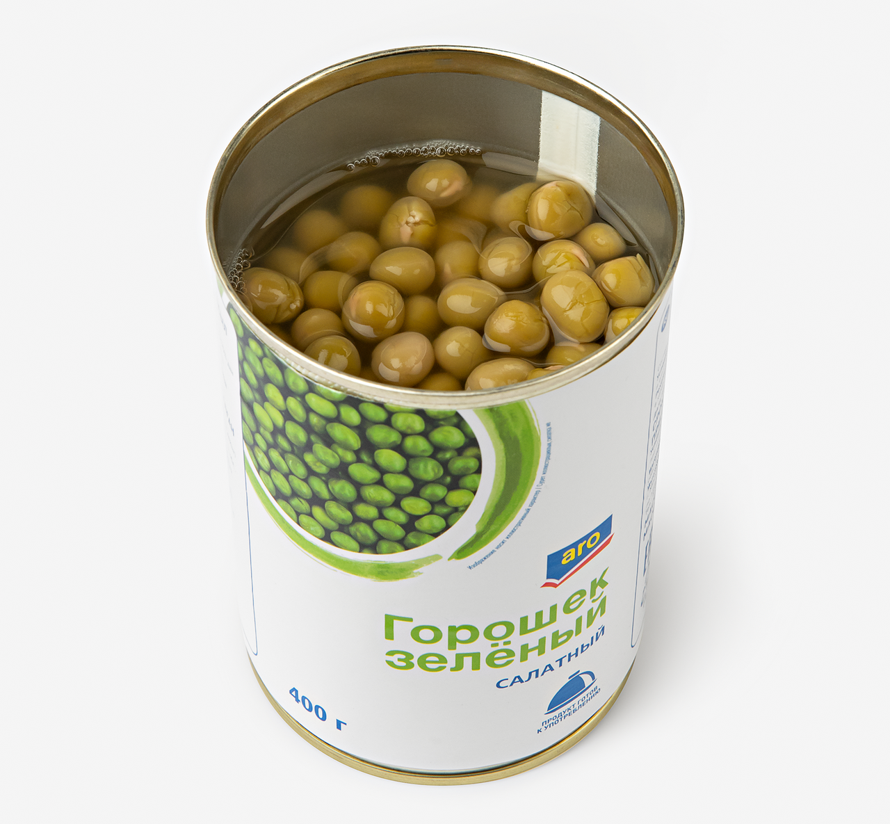 Горошек зеленый из мозговых сортов. Стерилизованный. Приготовлен из молодых нежных зерен. Является диетическим продуктом.
