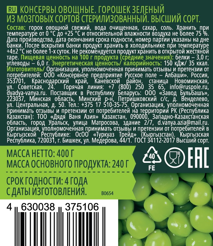 Горошек зеленый - Приготовлен по ГОСТ из мозговых сортов. Выращивается на собственных полях в Краснодарском крае. Отличный гарнир к мясным блюдам, ингредиент для салатов и закусок.