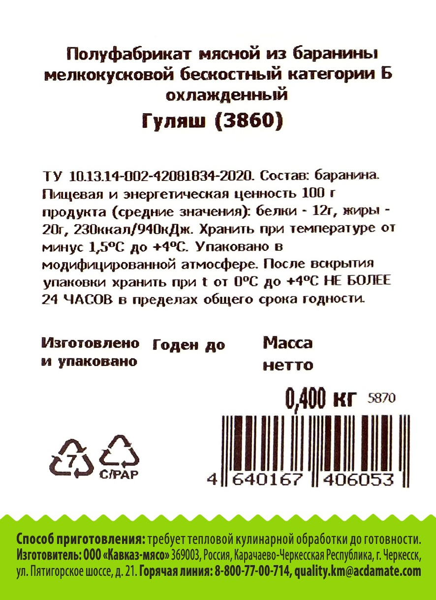 Гуляш БазарКо состоит из нарезанного произвольно мяса молодого барашка и станет основой для множества блюд. Ароматная шурпа, лагман или долма из сочного бараньего гуляша и овощей помогут разнообразить повседневное меню.