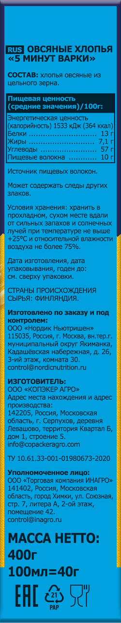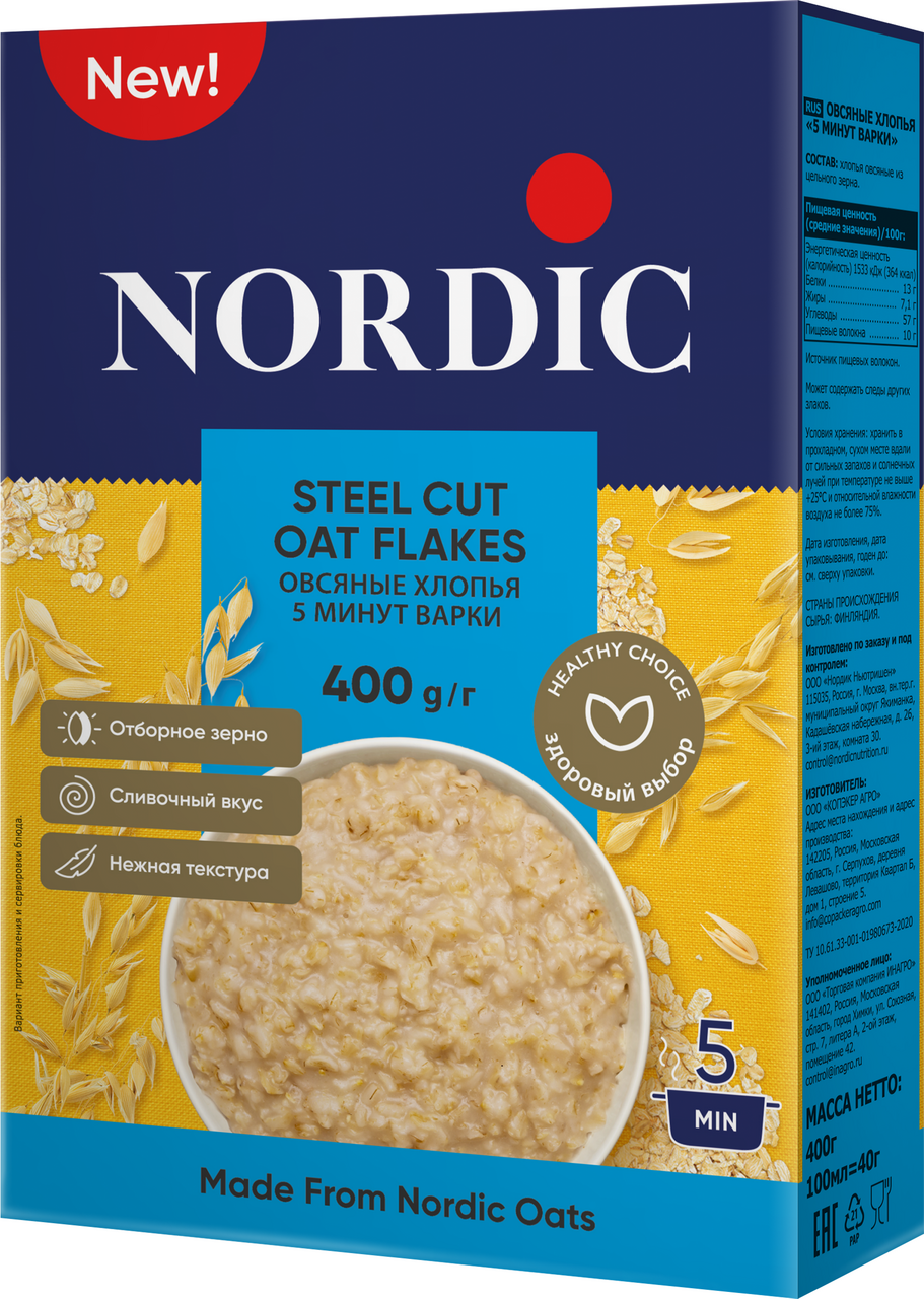 Хлопья овсяные Nordic 5 минут варки, 400г