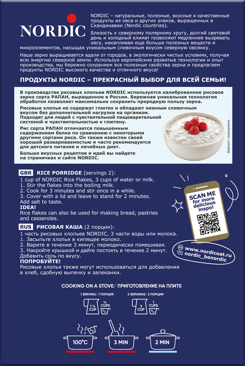 В производстве рисовых хлопьев Nordic используется калиброванное рисовое зерно сорта Рапан, выращенное в России. Бережная уникальная технология обработки позволяет максимально сохранить природную пользу зерна. Рисовые хлопья не содержит глютен и обладают нежным сливочным вкусом без дополнительной нагрузки на организм. Подходит для людей с чувствительной пищеварительной системой и чувствительностью к глютену. Рис сорта Рапан отличается повышенным содержанием белка по сравнению с некоторыми другими сортами риса. Он также известен своей хорошей развариваемостью и часто рекомендуется для детского питания и лечебных диет.