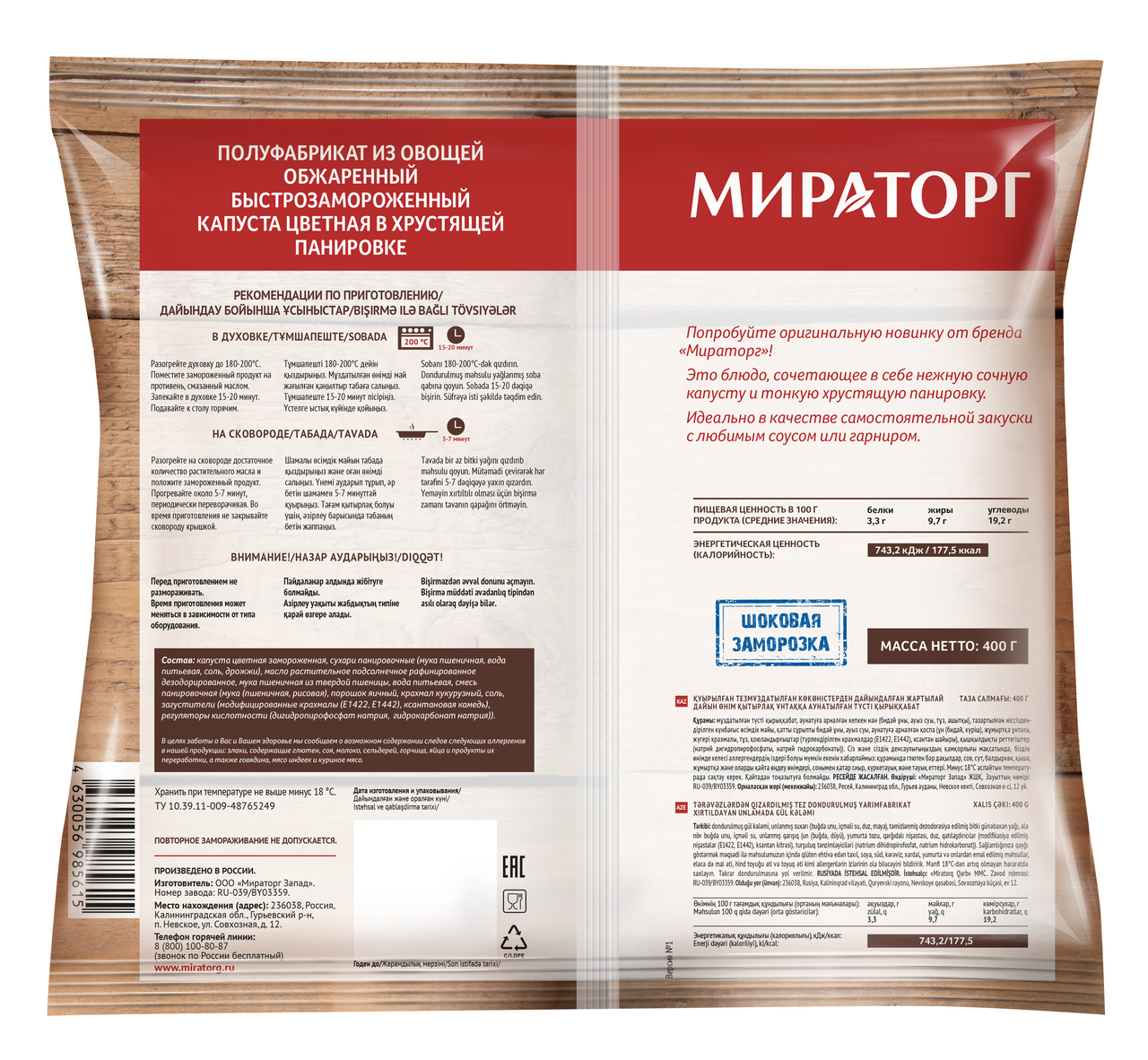 Капуста цветная замороженная, сухари панировочные мука пшеничная, вода питьевая, соль, дрожжи, масло растительное подсолнечное рафинированное дезодорированное, мука пшеничная из твёрдой пшеницы, вода питьевая, смесь панировочная мука пшеничная, рисовая, порошок яичный, крахмал кукурузный, соль, загустители модифицированные крахмалы E1422, E1442, ксантановая камедь, регуляторы кислотности дигидропирофосфат натрия, гидрокарбонат натрия.