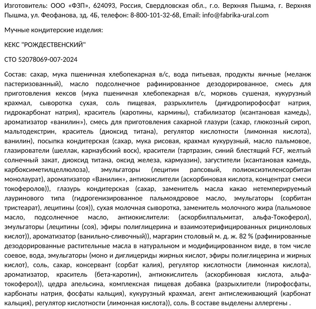 Сахар, мука пшеничная хлебопекарная в/с, вода питьевая, продукты яичные (меланж пастеризованный), масло подсолнечное рафинированное дезодорированное, смесь для приготовления кексов (мука пшеничная хлебопекарная в/с, морковь сушеная, кукурузный крахмал, сыворотка сухая, соль пищевая, разрыхлитель (дигидропирофосфат натрия, гидрокарбонат натрия), краситель (каротины, кармины), стабилизатор (ксантановая камедь), ароматизатор ванилин), смесь для приготовления сахарной глазури (сахар, глюкозный сироп, мальтодекстрин, краситель (диоксид титана), регулятор кислотности (лимонная кислота), ванилин), посыпка кондитерская (сахар, мука рисовая, крахмал кукурузный, масло пальмовое, глазирователи (шеллак, карнаубский воск), красители (тартразин, синий блестящий FCF, желтый солнечный закат, диоксид титана, оксид железа, кармуазин), загустители (ксантановая камедь, карбоксиметилцеллюлоза), эмульгаторы (лецитин рапсовый, полиоксиэтиленсорбитан монолаурат), ароматизатор Ванилин, антиокислители (аскорбиновая кислота, концентрат смеси токоферолов)), глазурь кондитерская (сахар, заменитель масла какао нетемперируемый лауринового типа (гидрогенизированное пальмоядровое масло, эмульгаторы (сорбитан тристеарат), лецитины (соя)), сухая молочная сыворотка, заменитель молочного жира (пальмовое масло, подсолнечное масло, антиокислители: (аскорбилпальмитат, альфа-Токоферол), эмульгаторы (лецитины (соя), эфиры полиглицерина и взаимоэтерифицированных рициноловых кислот)), ароматизатор (ванильно-сливочный)), маргарин столовый м. д. ж. 82 % (рафинированные дезодорированные растительные масла в натуральном и модифицированном виде, в том числе соевое, вода, эмульгаторы (моно и диглицериды жирных кислот, эфиры полиглицерина и жирных кислот), соль, сахар, консервант (сорбат калия), регулятор кислотности (лимонная кислота), ароматизатор, краситель (бета-каротин), антиокислитель (аскорбиновая кислота, альфа-токоферол)), цедра апельсина, комплексная пищевая добавка (разрыхлители (пирофосфаты, карбонаты натрия, фосфаты кальция), кукурузный крахмал, агент антислеживающий (карбонат кальция), регулятор кислотности (лимонная кислота)), соль.