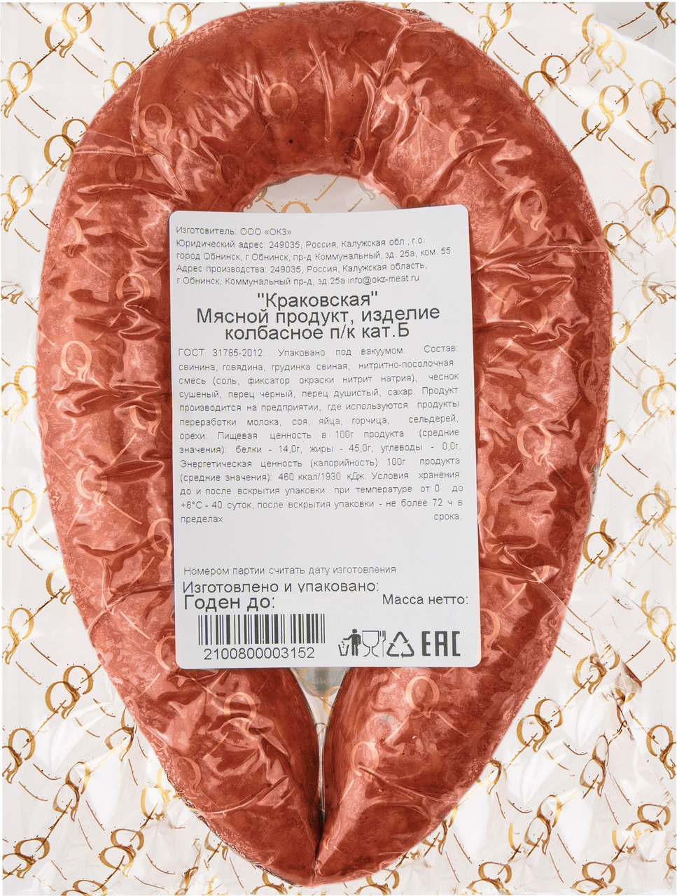 Колбаса Обнинский Краковская полукопченая, ~400г