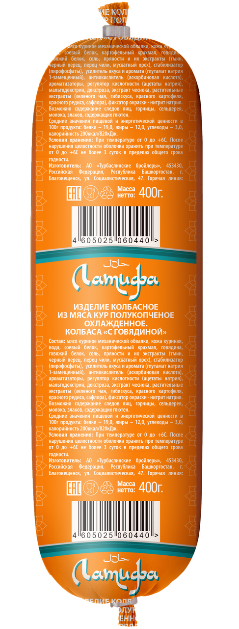 Колбаса Латифа Халяль с говядиной полукопченая, 400г
