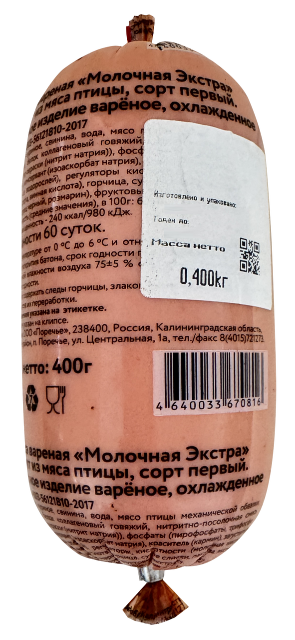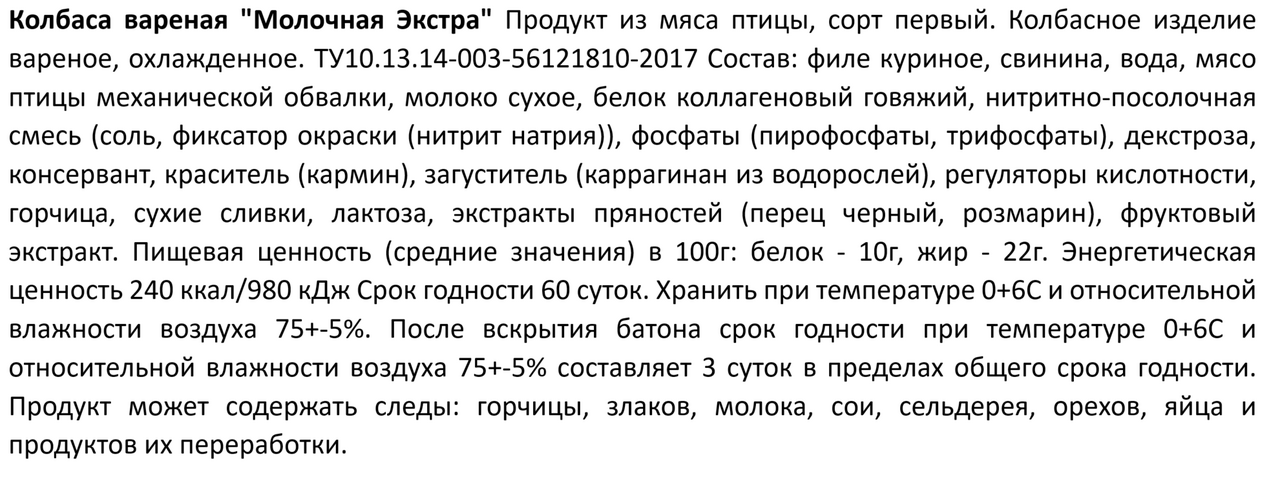 Филе куриное, свинина, вода, молоко сухое, сухой белок коллагеновый животный говяжий, стабилизатор, регулятор кислотности, сахара, усилитель вкуса и аромата, специи, экстракт специй, антиокислитель, аромат сливок, краситель, нитритно-посолочная смесь.