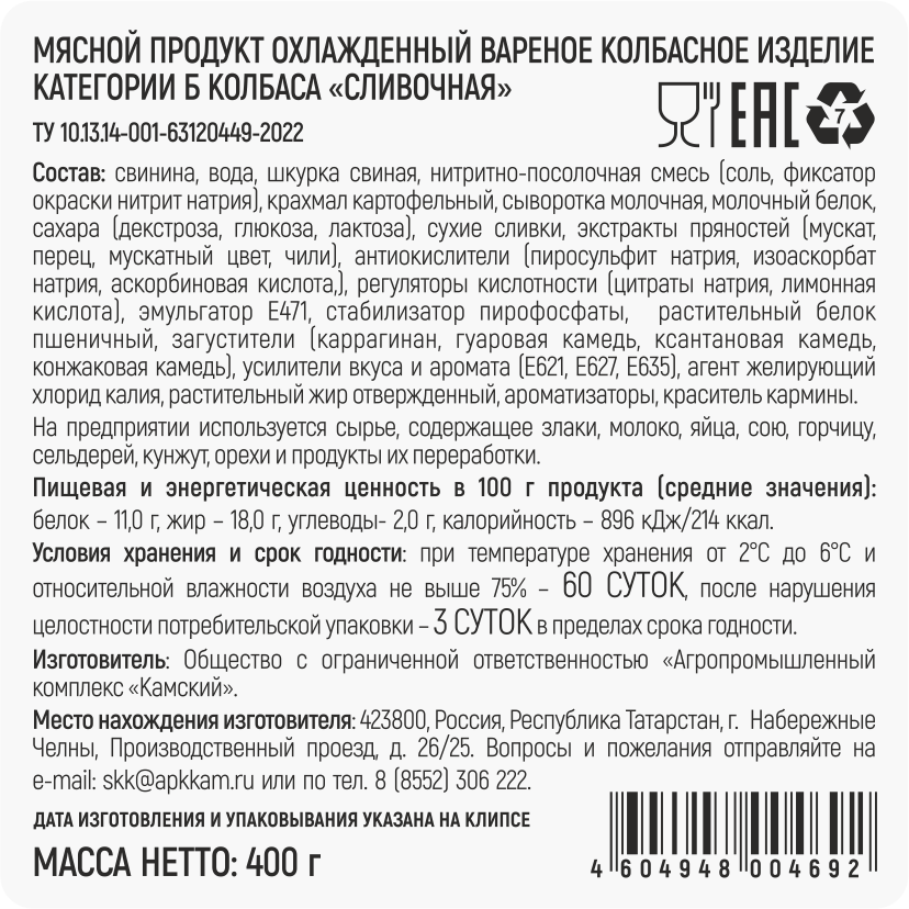 Свинина, вода, шкурка свиная, нитритно-посолочная смесь соль, фиксатор окраски нитрит натрия, крахмал картофельный, сыворотка молочная, молочный белок, сахара декстроза, глюкоза, лактоза, сухие сливки, экстракты пряностей мускат, перец, мускатный цвет, чили, антиокислители пиросульфит натрия, изоаскорбат натрия, аскорбиновая кислота, регуляторы кислотности цитраты натрия, лимонная кислота, агент желирующий хлорид калия, растительный жир отвержденный, ароматизаторы, краситель кармины.