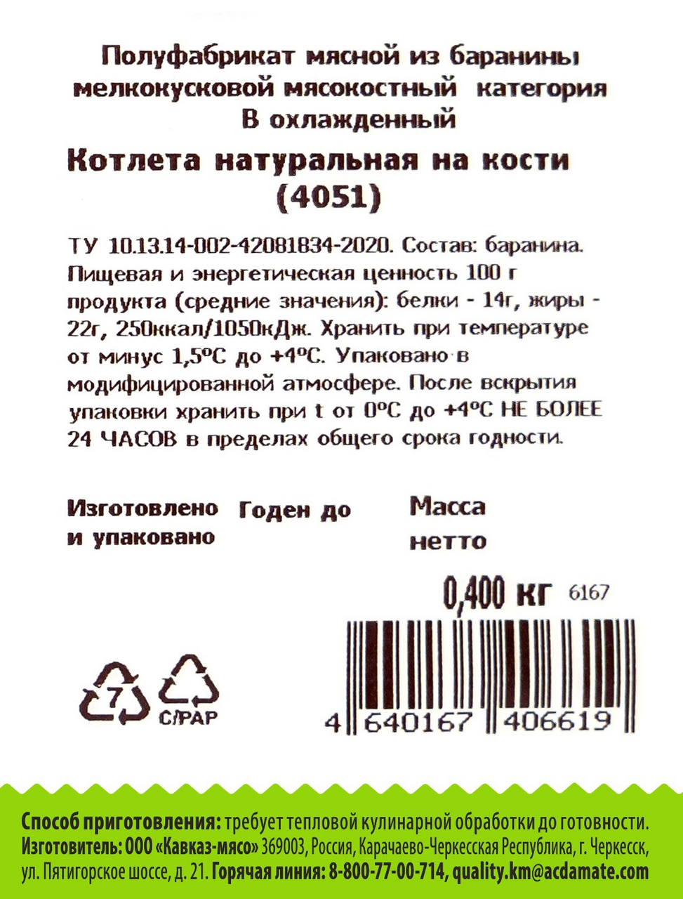 Котлета из баранины Bazarco Халяль натуральная на кости охлажденная, 400г