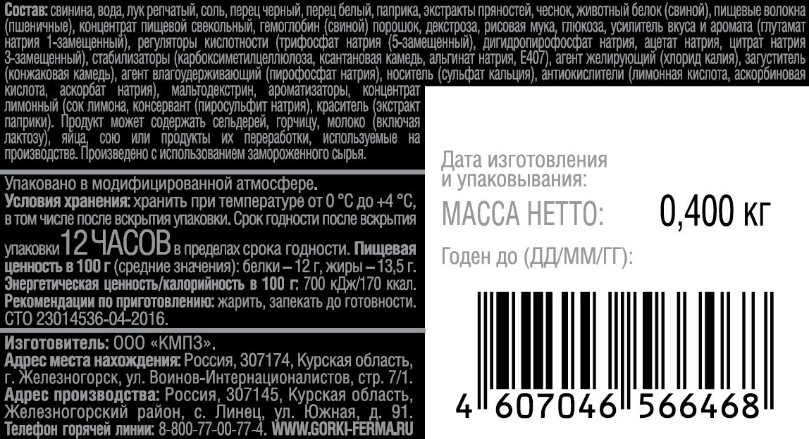 Свинина, лук, соль, пряности и их экстракты (перец черный, перец белый), чеснок.